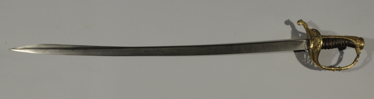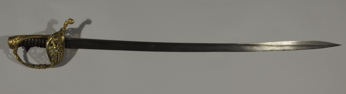 Poignée en corne. Monture en laiton ciselé et doré à décor d'écailles et de coquilles, garde à coquille ciselée et ajourée à décor d'ancre sous couronne. Lame cintrée à dos arrondi, contre tranchant et pointe ramenée au centre.
