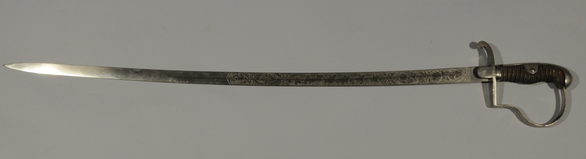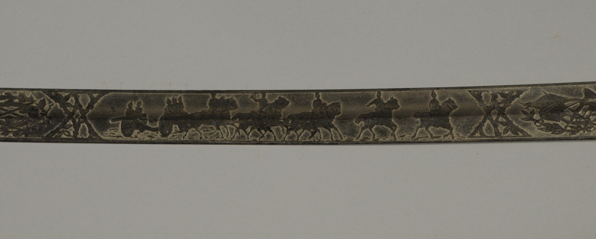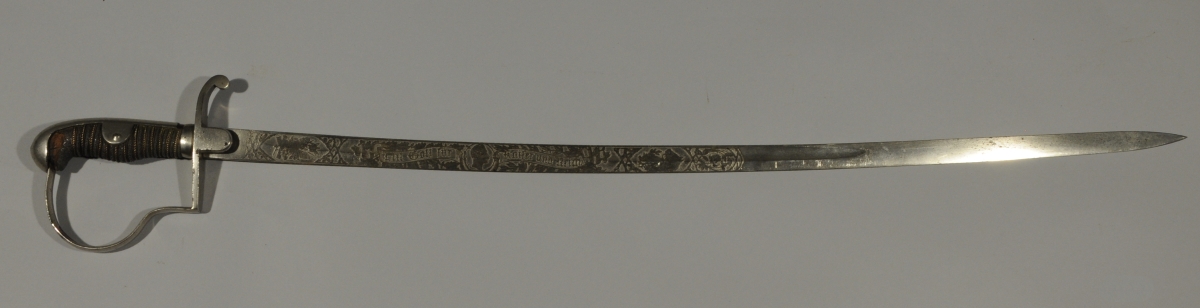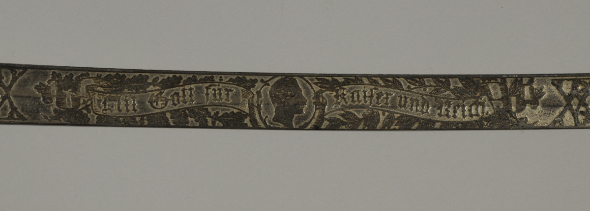 Poignée en bois recouvert de galuchat avec filigrane (manques). Monture en fer nickelé, garde à la Blücher à deux demi oreillons, un matriculé 43 A I 39. Lame courbe à dos plat et pans creux richement gravé à moitié de train d'artillerie, casque à boule sur une face et sur l'autre " Mitt Gott für Kaiser und Reich " et profil de l'Empereur Guillaume II.