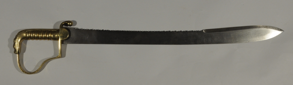 Monture et poignée en laiton, pommeau en tête de lion, garde à une branche. Lame à dos scie et fort contre tranchant marquée au talon " S J Dawe ".