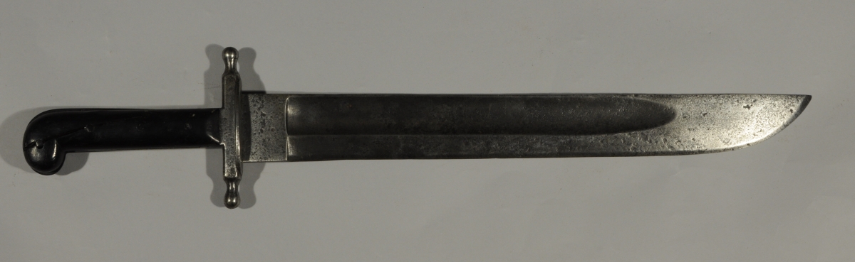 Poignée à plaquettes de bois à trois boutons de rivure. Monture en fer à deux quillons, matriculé. Large lame datée " 87 " à dos plat et pans creux.