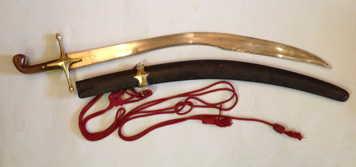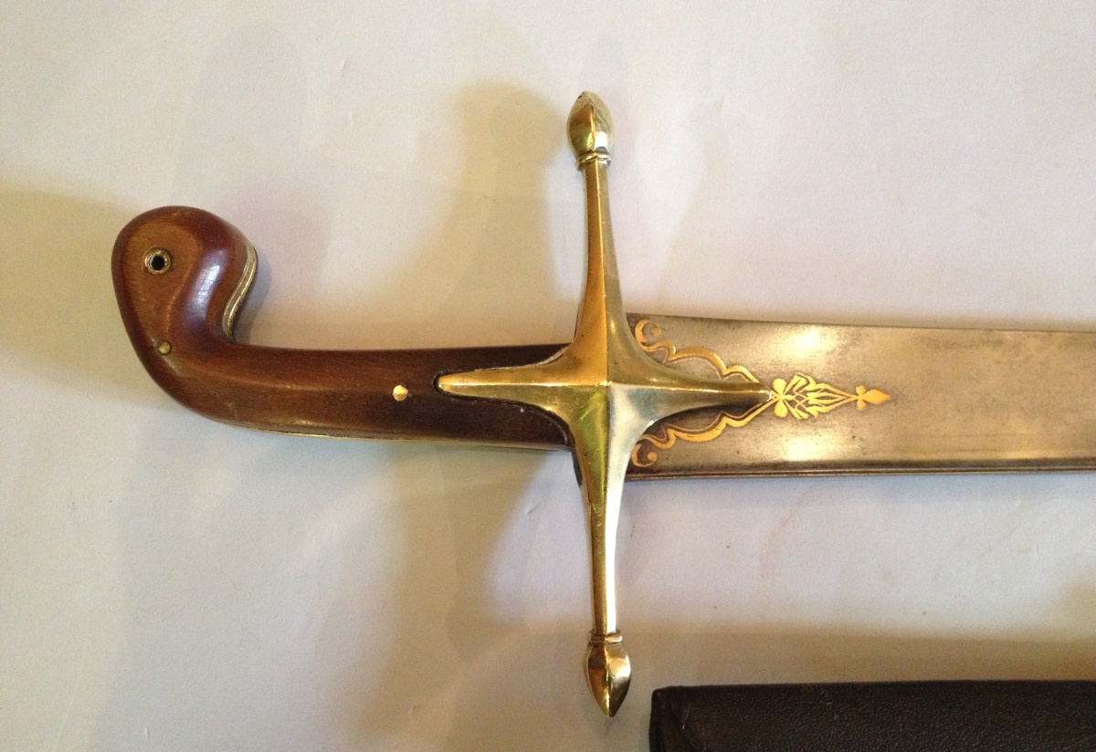 Poignée à plaquettes de corne. Monture en laiton, garde à deux oreillons et deux quillons droits finissant en olive. Lame courbe à dos plat et large contre tranchant, décoré à l'or au talon de rinceaux et d'inscriptions en arabe.