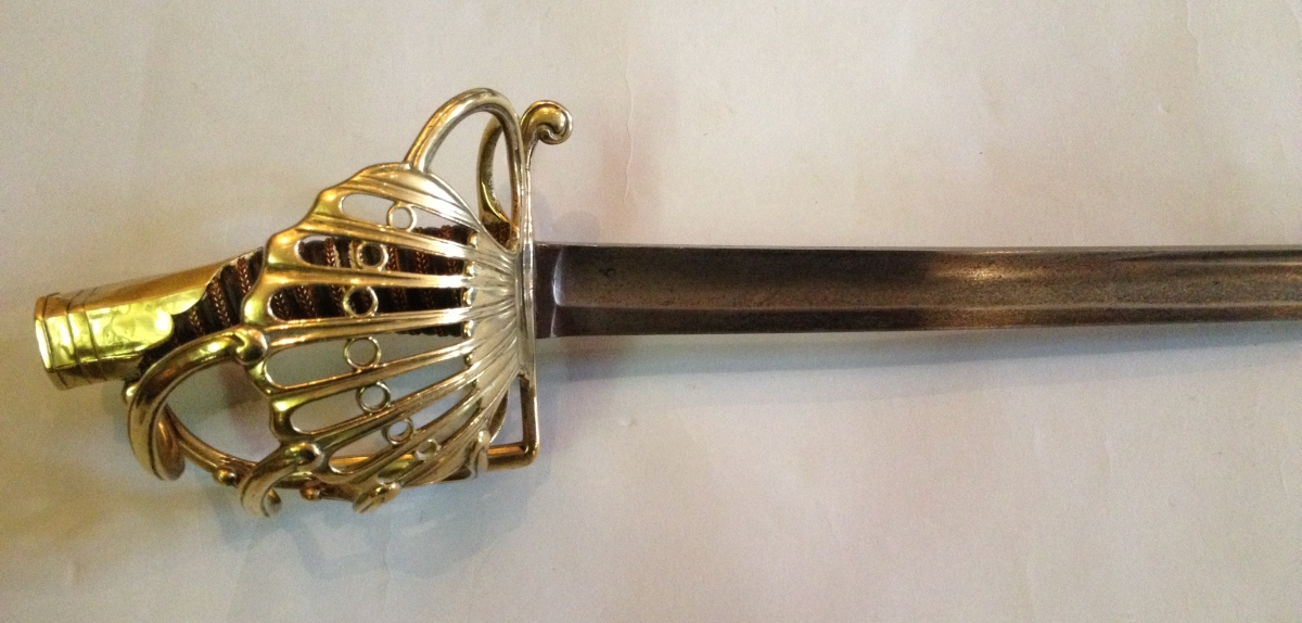 Poignée recouverte de basane avec filigrane. Monture en laiton, calotte à pans, garde à coquille ajourée (traces de poinçons). Lame cintrée à dos plat gravé " Mture de Klingenthal ", pans creux et contre tranchant.