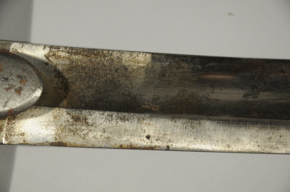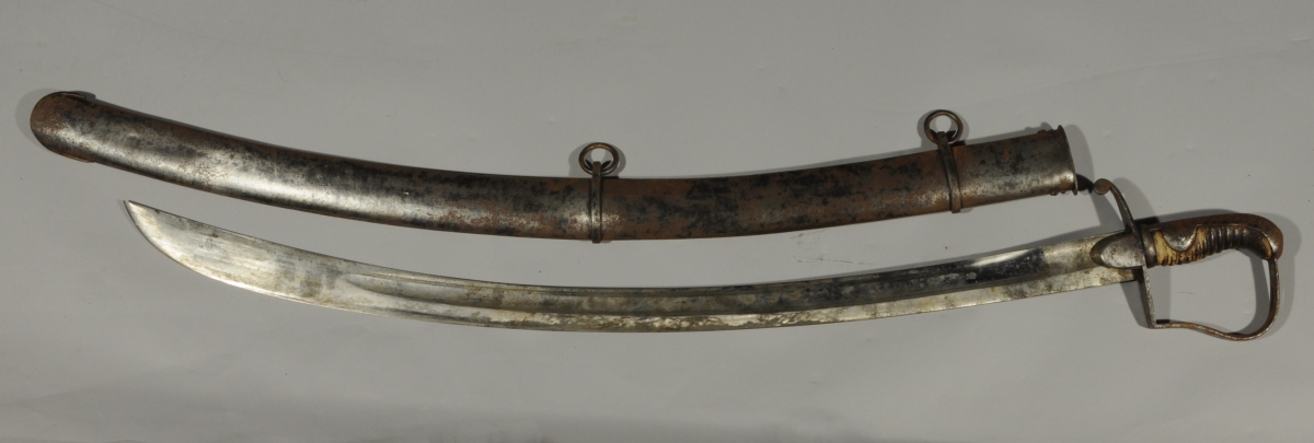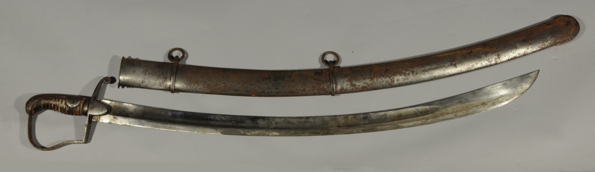 SABRE DE CAVALERIE prussien ou britannique. Monture en fer, garde à une branche à la Blücher, à deux demi oreillons. Lame courbe à dos plat, pans creux. Fourreau en tôle de fer à deux bracelets.