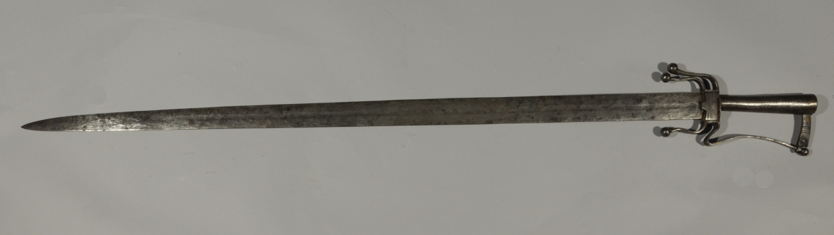 Poignée et monture en fer gravé, garde à une branche et trois quillons recourbés. Lame droite (oxydation).