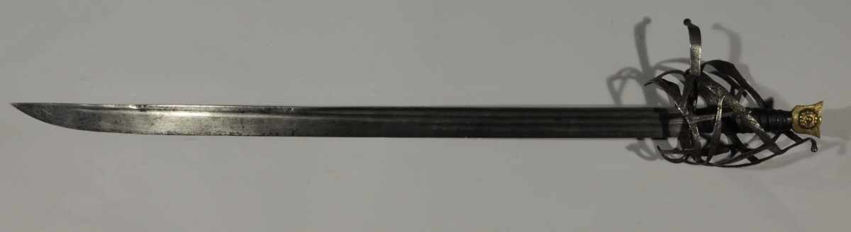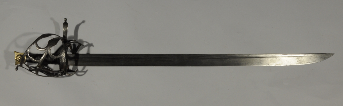 Poignée en bois recouvert de chagrin. Pommeau en laiton, garde en panier à branches multiples en fer forgé. Monté avec une lame droite à dos plat à trois gouttières de longueurs différentes.