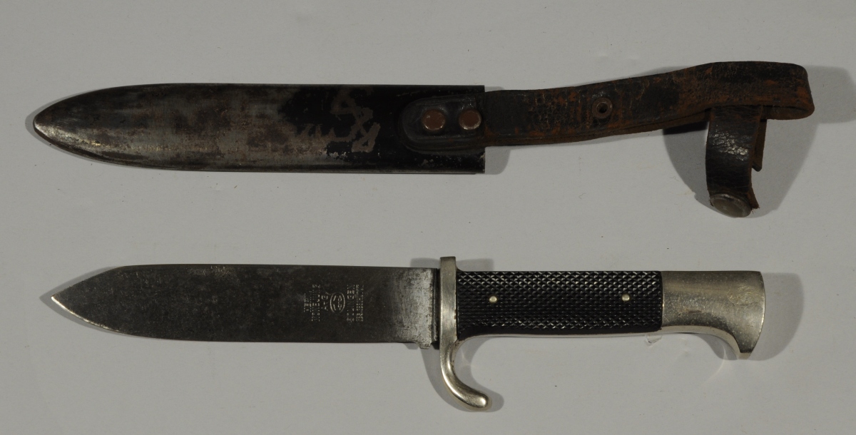 Poignée quadrillée avec insigne. Monture nickelée. Lame avec restes de signature. Fourreau en tôle de fer. Support en cuir.