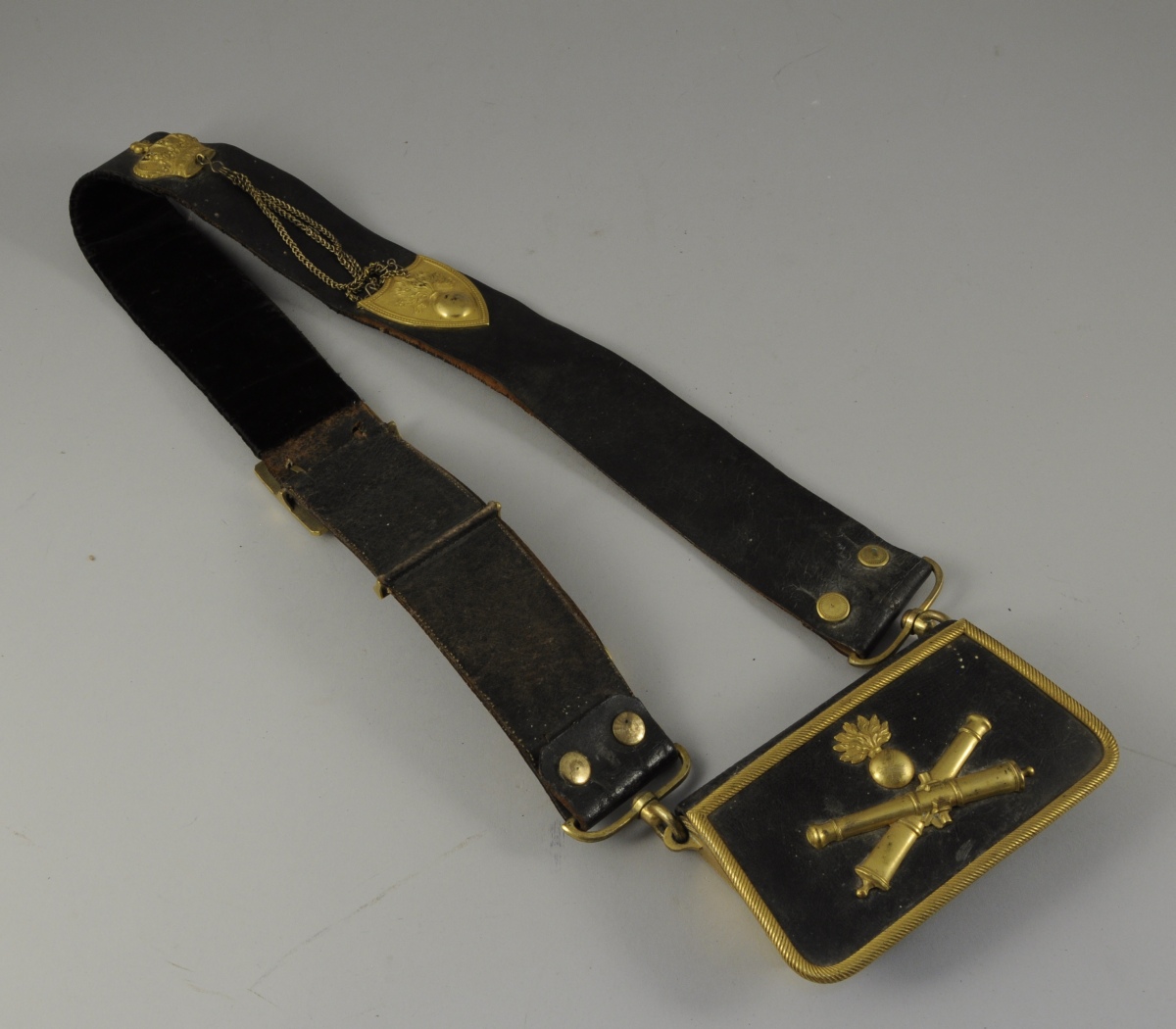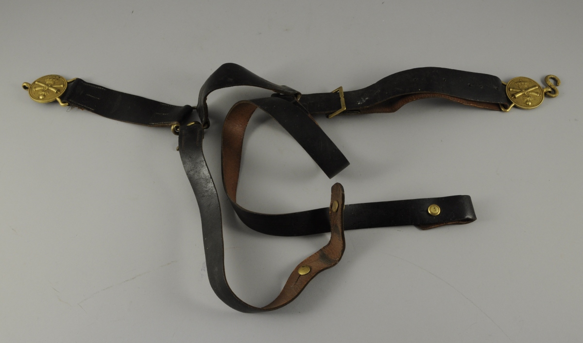En cuir verni noir (postérieur). Boucle agrafe en laiton doré aux canons entrecroisés sous couronne royale.