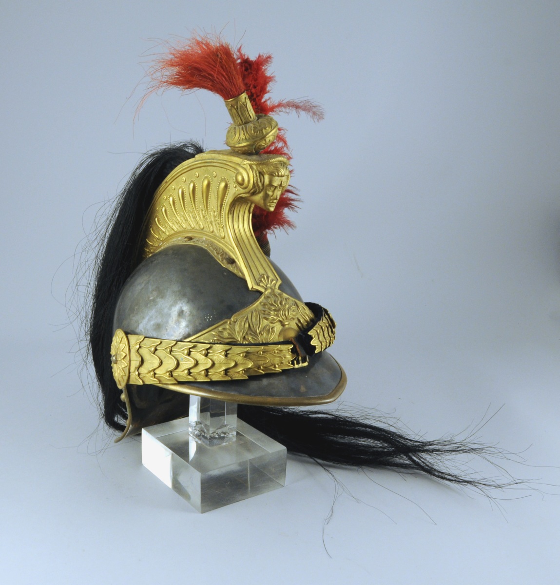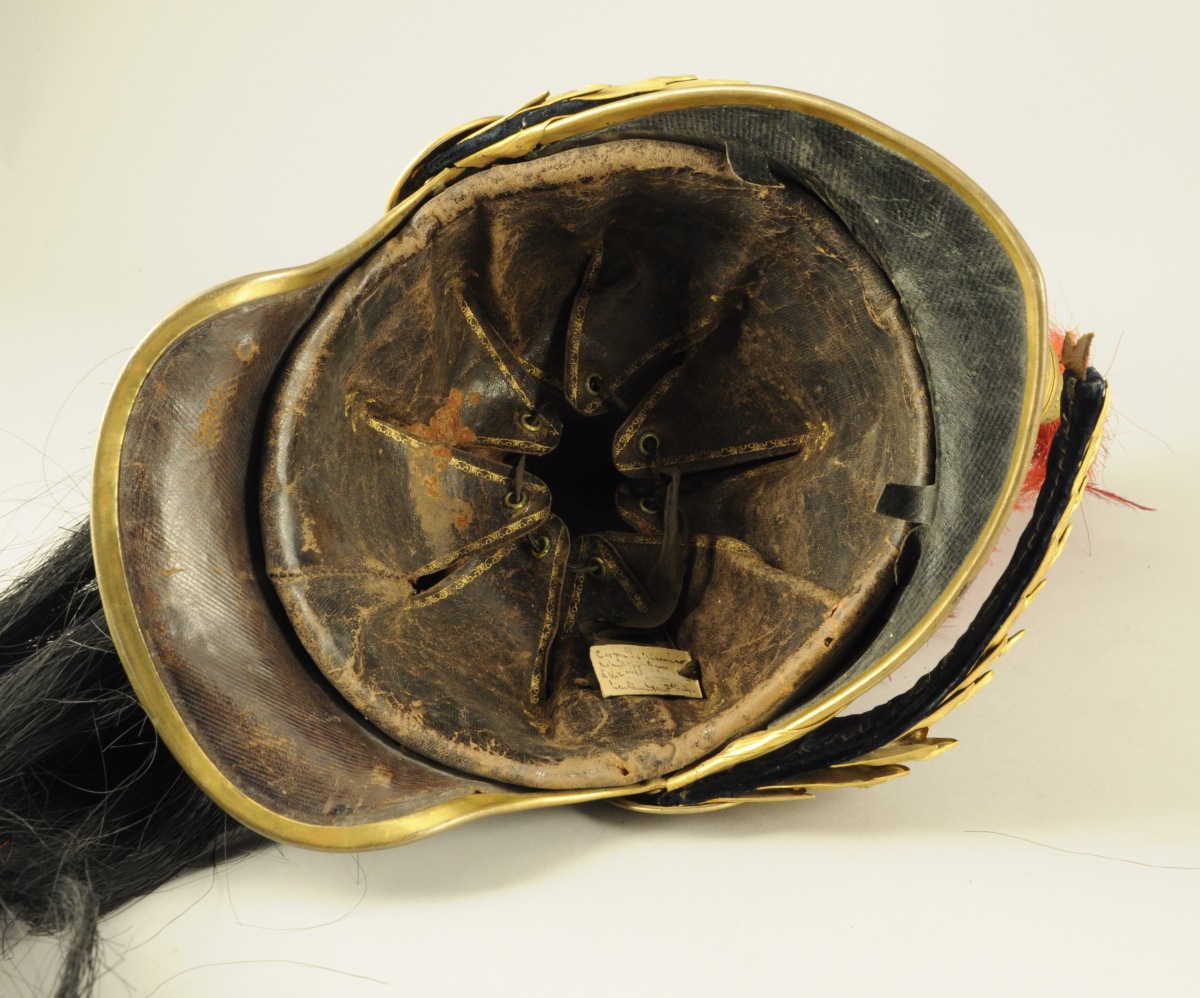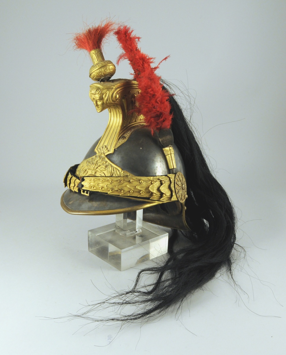 Bombe argentée. Marmouzet, cimier, bandeau à la Grenade, porte plumet, jonc rosaces et jugulaires à écailles doublées de velours bleu nuit en laiton doré. Houpette de marmouzet en crin rouge, crinière et natte en crin noir. Visière et nuquière doublé de basane. Coiffe intérieure en maroquin décoré au petit fer à l'or avec étiquette manuscrite " Casque de cuirassier ayant appartenu à Mr