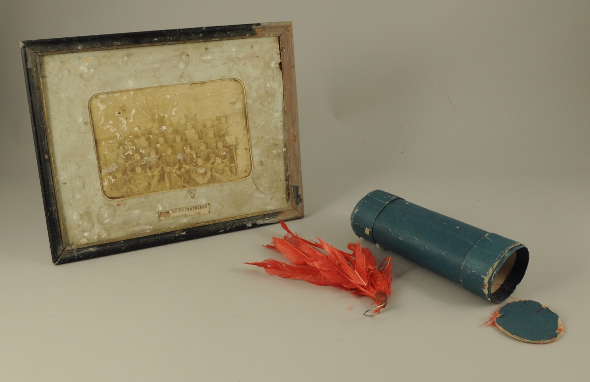 B.E. On y joint un plumet dans sa boîte et une photographie des officiers du 7ème cuirassiers en 1882 en mauvais état.