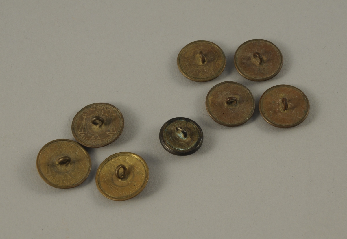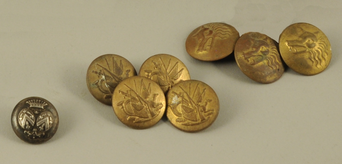 8 BOUTONS DE VÉNERIE dont un en argent (?) aux armes de la famille Fremond de La Merveillère.
