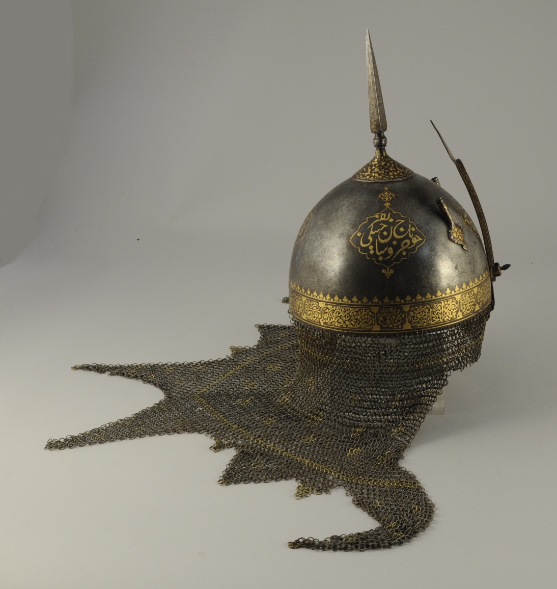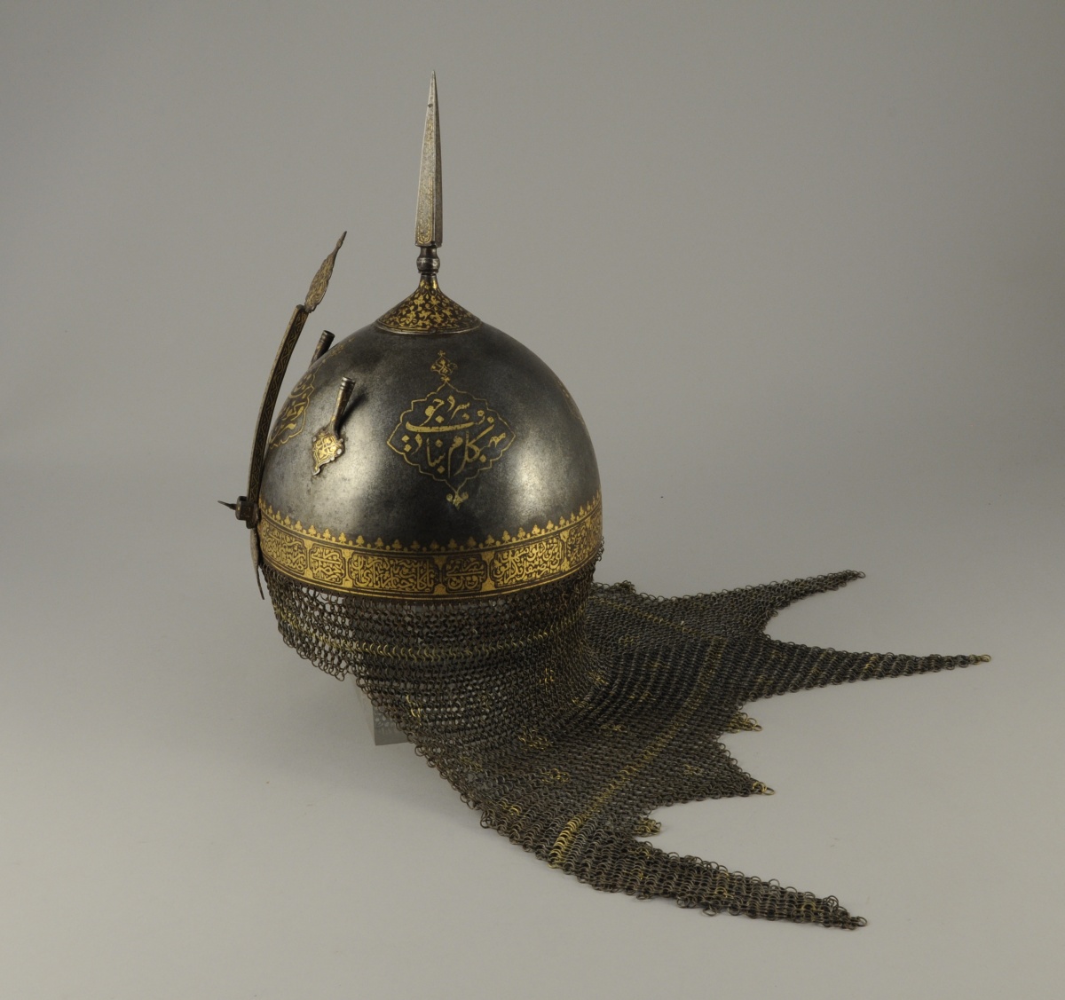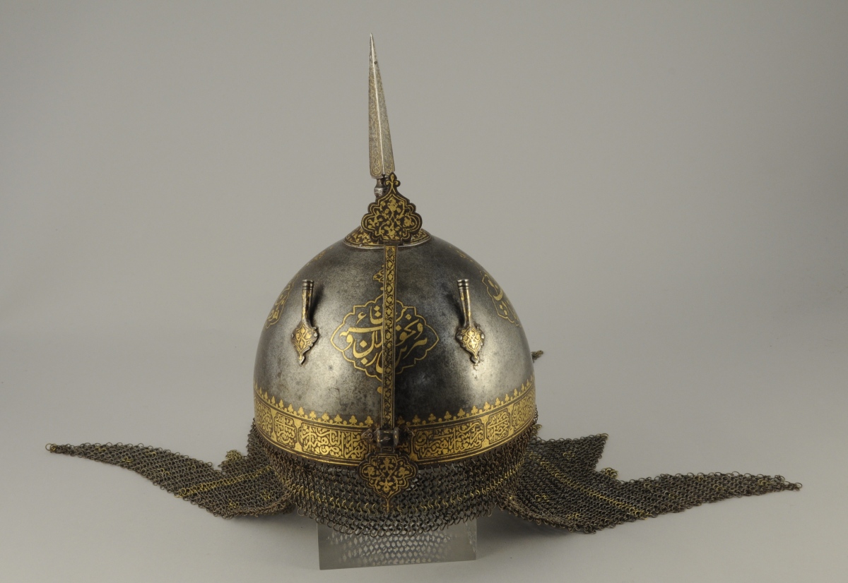 Bombe en fer forgé décoré à la base d'une riche frise d'inscriptions et en partie haute de quatre médaillons en arabe, surmontée d'une pointe à quatre pans et portant sur le devant, deux porte-plumails et un nazal. L'ensemble richement décoré à l'or de rinceaux et de feuillages