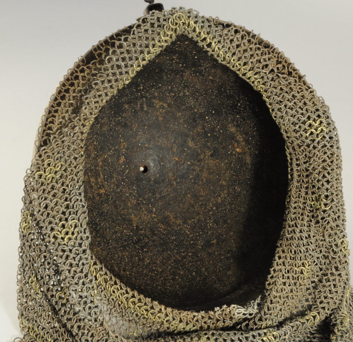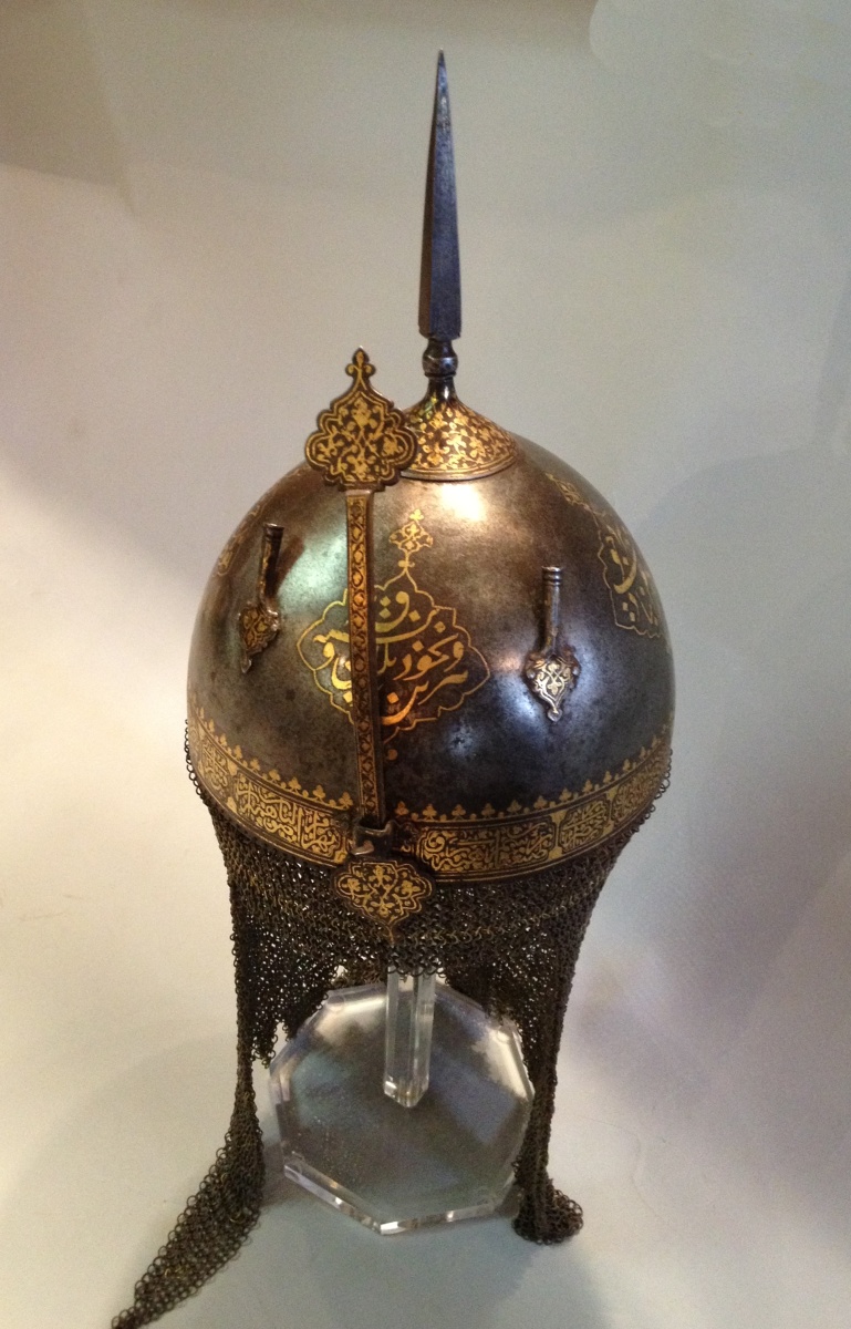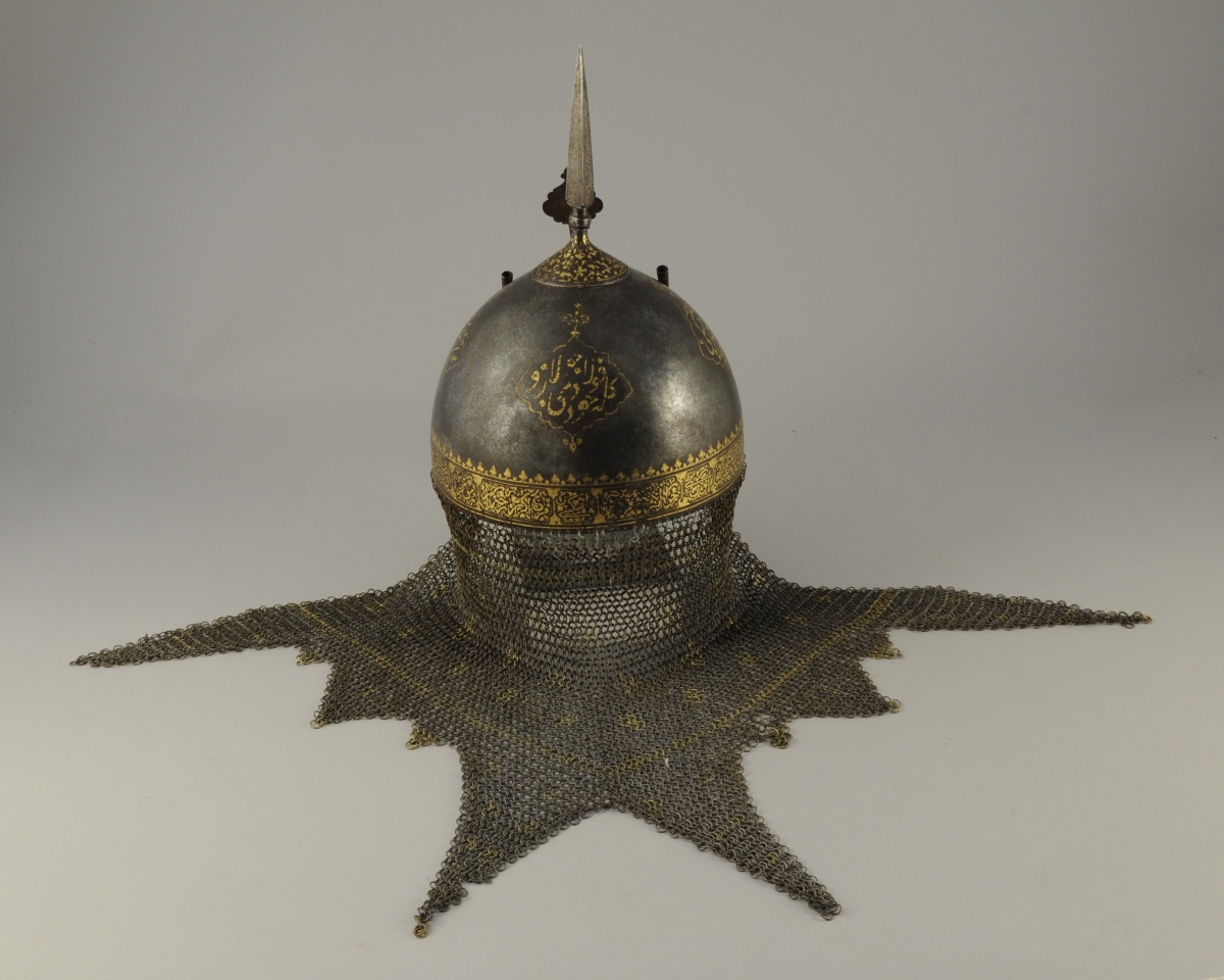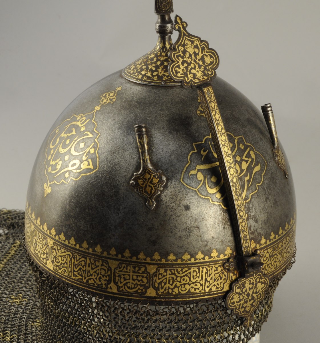 Bombe en fer forgé décoré à la base d'une riche frise d'inscriptions et en partie haute de quatre médaillons en arabe, surmontée d'une pointe à quatre pans et portant sur le devant, deux porte-plumails et un nazal. L'ensemble richement décoré à l'or de rinceaux et de feuillages
