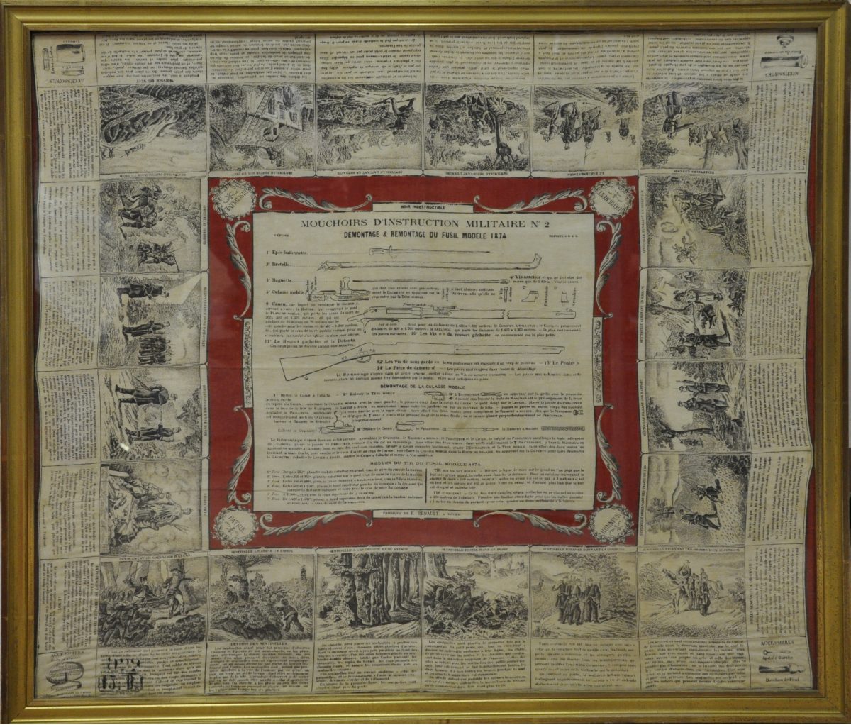 "MOUCHOIR D'INSTRUCTION MILITAIRE N°2 / Démontage et remontage du fusil modèle 1874". Dans un cadre en bois doré. Fin XIXème-début XXème. 65,5 x 74 cm.
