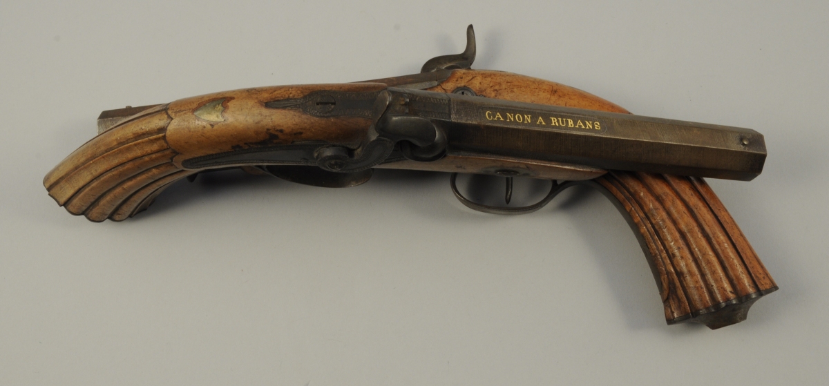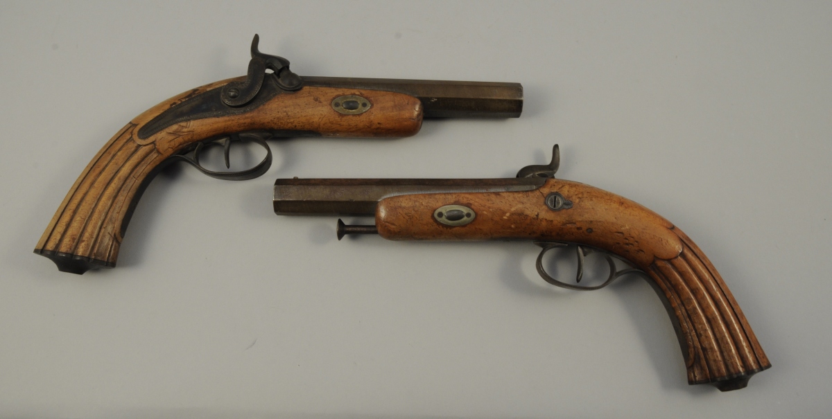 PAIRE DE PISTOLETS à percussion. Le chien, le pontet et la platine ciselés de dentelures. Canons octogonaux en damas de fort calibre, l'un marqué à l'or " canon à rubans ". Crosse en noyer cannelée. Pièce de pouce rapportée. Vers 1840.