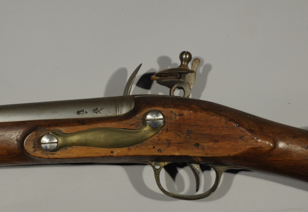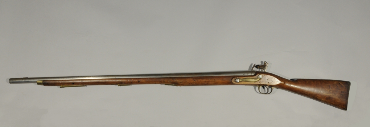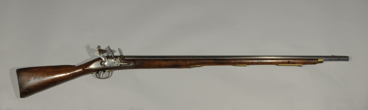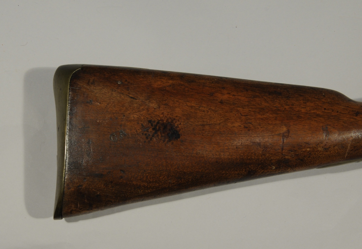 Canon rond poinçonné au tonnerre. Platine à corps plat signé " T.POTTS LONDON " et chien à corps rond. Garnitures en laiton. Crosse en noyer avec marquages de la Garde nationale "P.L.D. "
