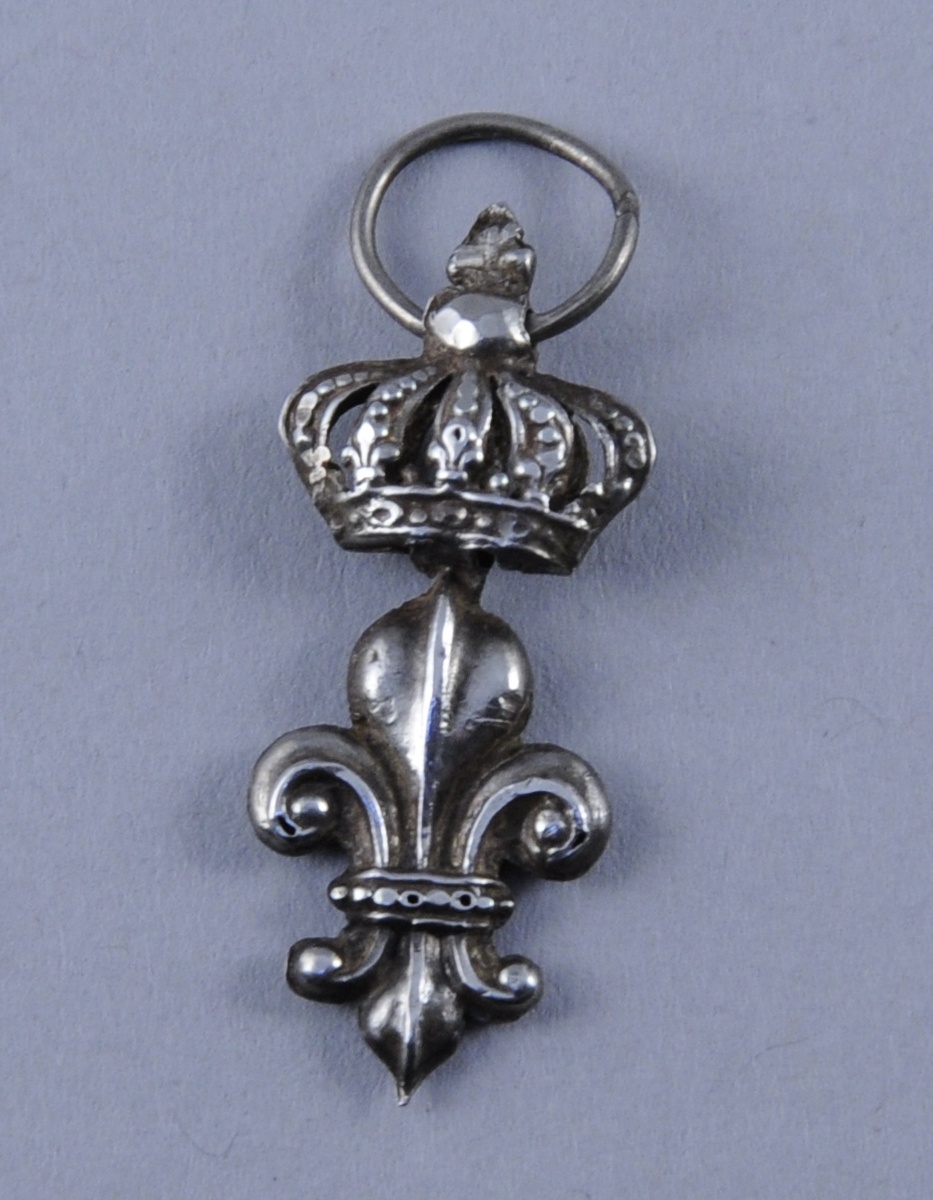 DÉCORATION DU LYS, lys en argent gaufré surmonté d'une couronne royale articulée. Poinçon au faisceau de licteur sur l'anneau de bélière.