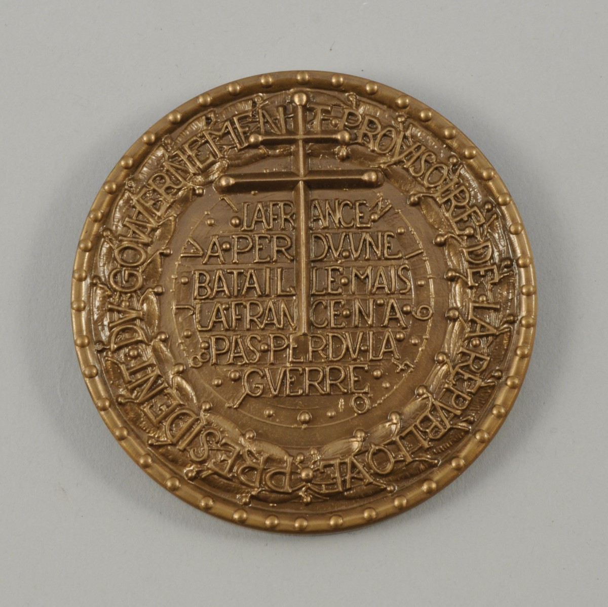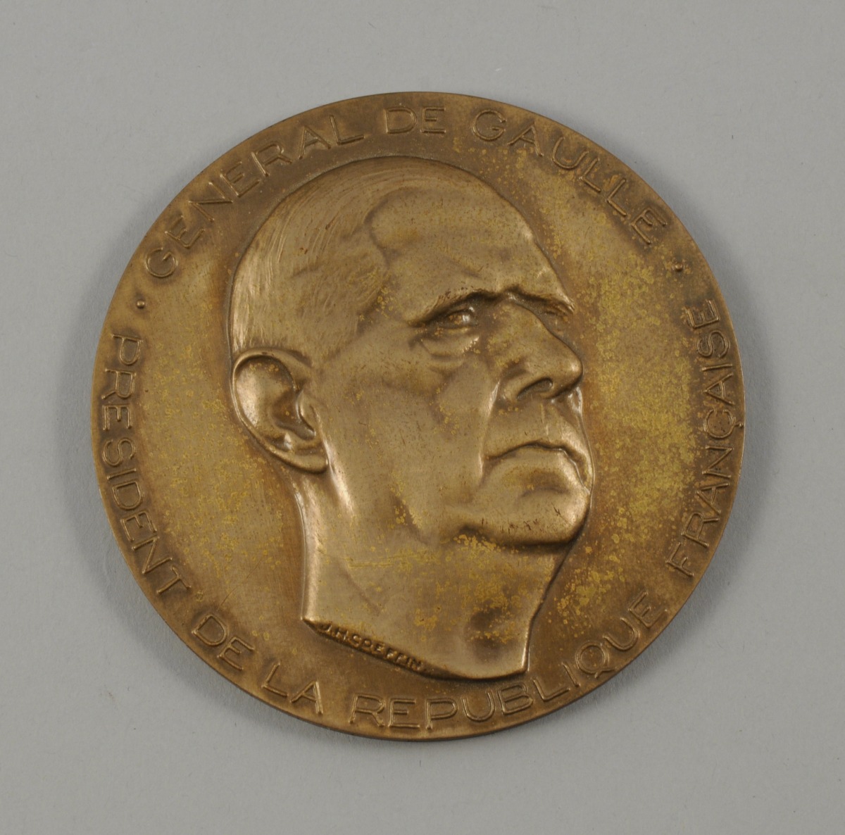 La seconde: Avers figurant le visage du général avec la mention: "GÉNÉRAL DE GAULLE / PRÉSIDENT DE LA RÉPUBLIQUE FRANÇAISE". Revers figurant une croix de Lorraine avec la mention "FRANCE". La tranche marquée "LIBERTÉ / ÉGALITÉ / FRATERNITÉ". Signée J.H. COËFFIN et datée 1968. Poinçon de la Monnaie de Paris. Diam. 8 cm.