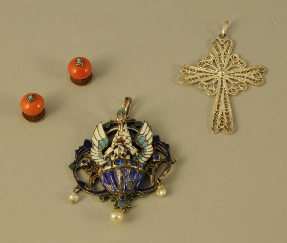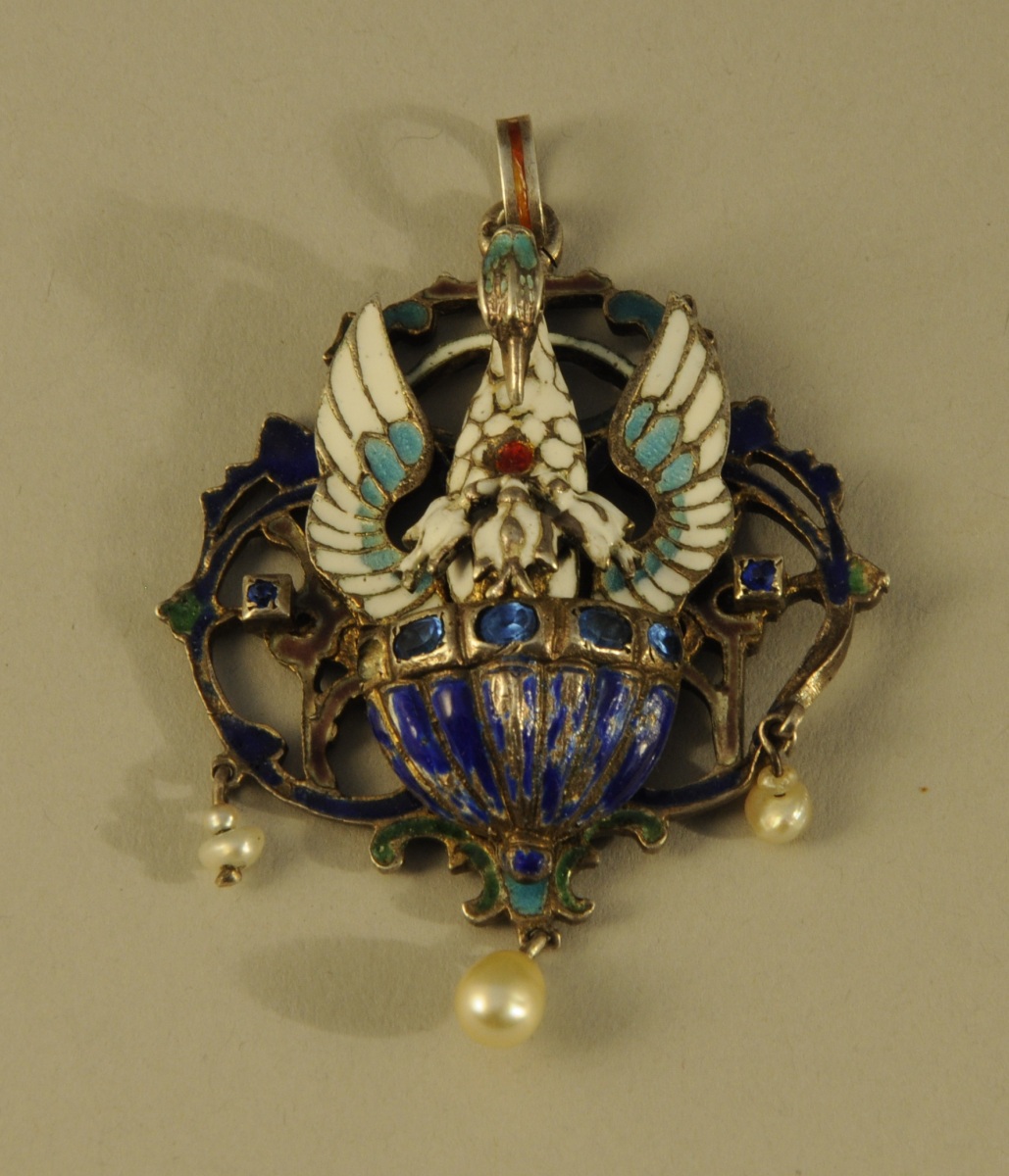 -PENDENTIF en métal émaillé blanc, bleu ciel, vert rouge et bleu foncé représentant le Sacrifice du Pélican. L'oiseau est encadré d'arabeques, son réceptacle serti de pierres fines bleues. Les pendentif se termine par trois pendeloques retenant une perle. Travail dans le goût des bijoux de la Renaissance, fin XIXème, début XXème. Haut. 5,5, Larg. 4,5 cm. (accidents)