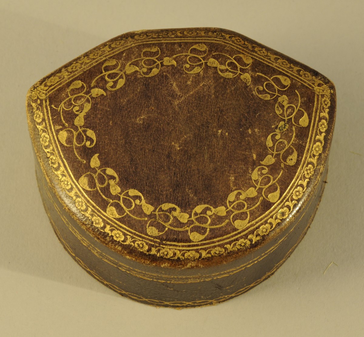JOINT: BOITE en maroquin aubergine doré aux petits fers garnie de tissu rouge. Haut. 3,8, Long. 8,3, Larg. 6,9 cm.