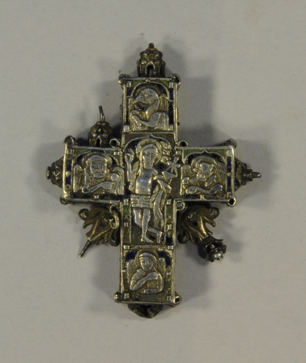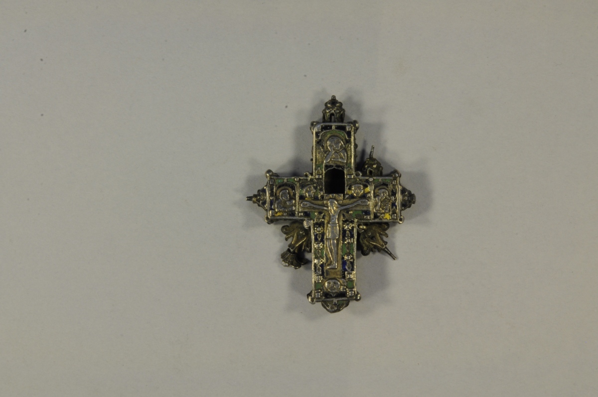 - CROIX - RELIQUAIRE en argent émaillée vert, bleu et jaune. A l'avers y est représenté le Christ en Croix encadré de Saints Personnages et d'un Ange. Le revers présente la Résurrection encadrée par les symboles des quatres Evangélistes. Eglise Orthodoxe. Haut. 6,5, Larg. 5,2 cm. (manques)