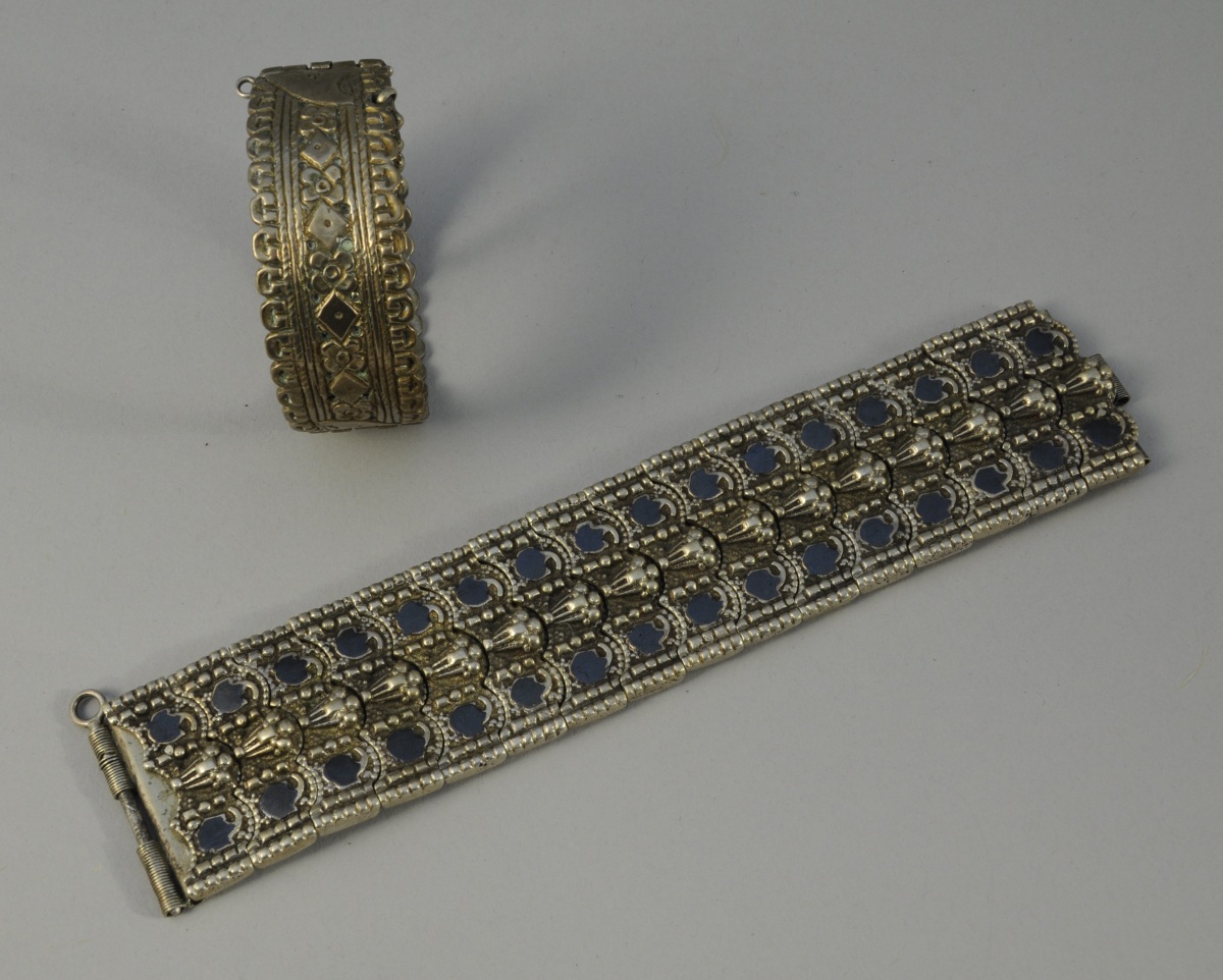 -BRACELET rond rigide en argent anciennement doré présentant un décor de frises de fleurettes et losanges, d'agrafes, de filets et cordelettes. Une chaînette y est accrochée. Diam. 6 cm.