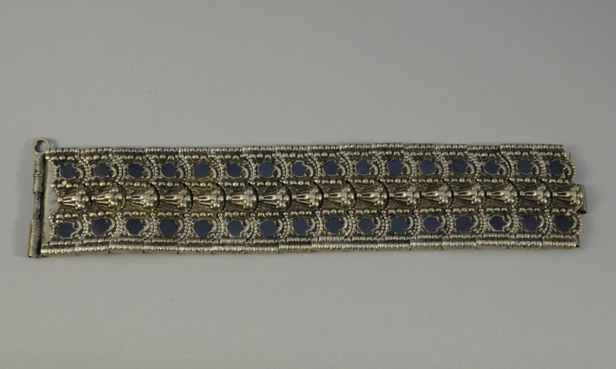 -BRACELET en argent composé de seize maillons articulés sur une âme en cuir. Il reçoit un décor de rais de perle, motifs géométriques et fleurs stylisées incrustées de nielle. Travail turc. Long. 18 cm.