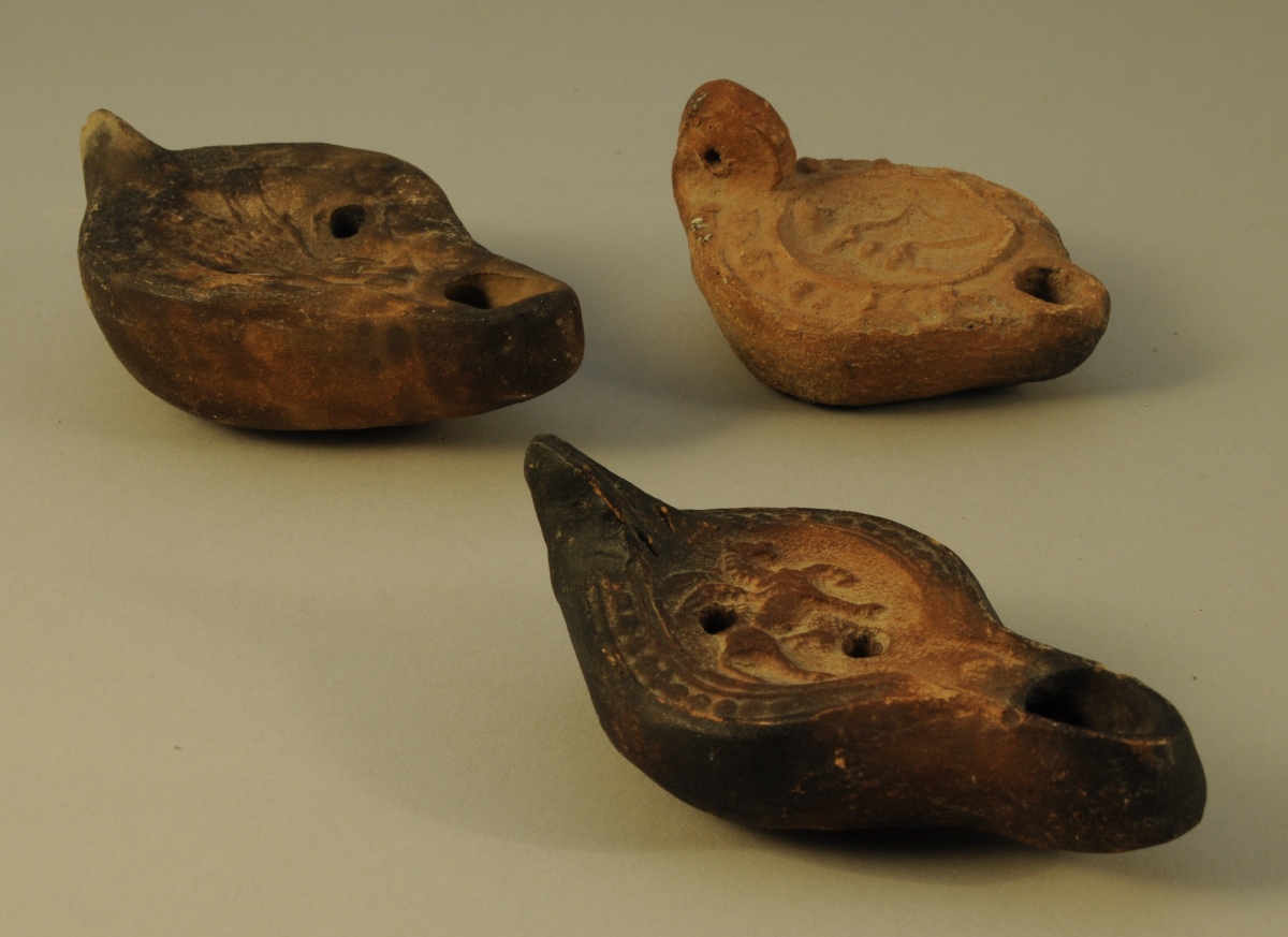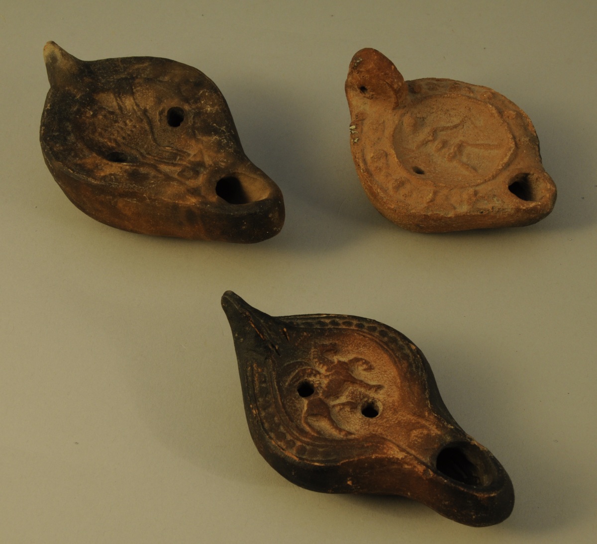 TROIS LAMPES à HUILE en terre cuite. Deux à décor en léger relief d'un cheval ailé, une d'un personnage. Bassin méditérranéen. Long. 12,5, 11 et 10 cm. (usures, petits manques)