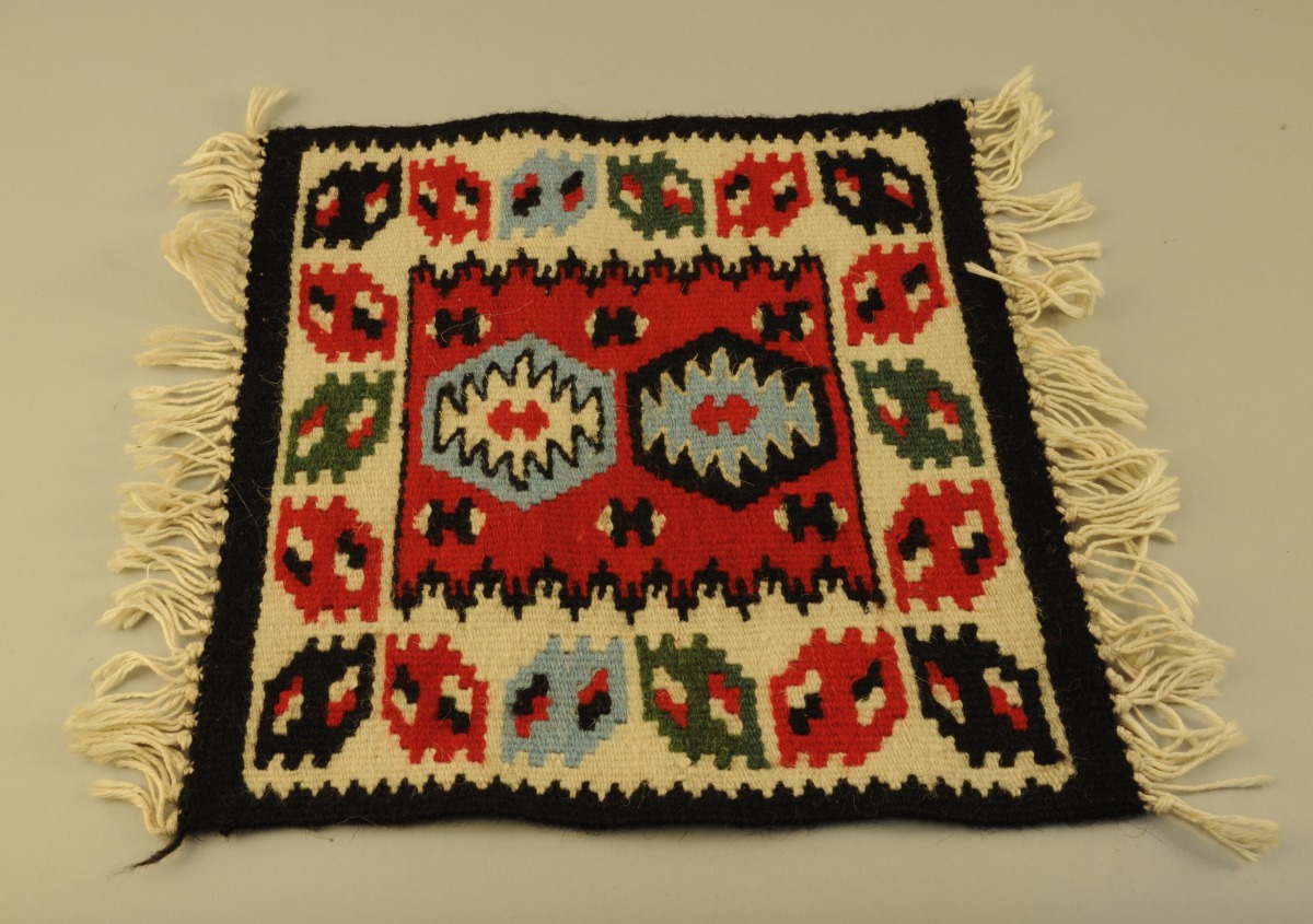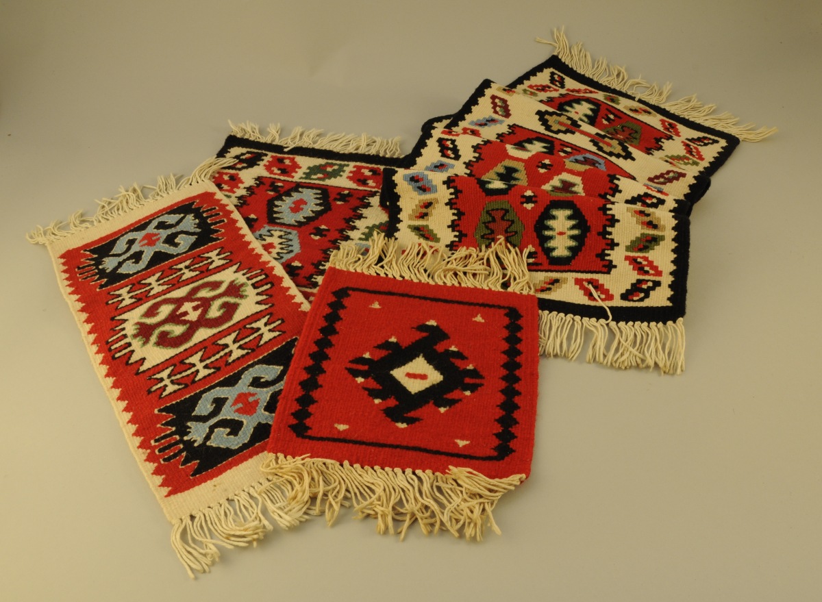 LOT de NAPPERONS tissés à motifs Kilim. Deux à fond rouge et deux à fond crème. Les bords frangés. Le plus grand: Long. 104, Larg. 30 cm.