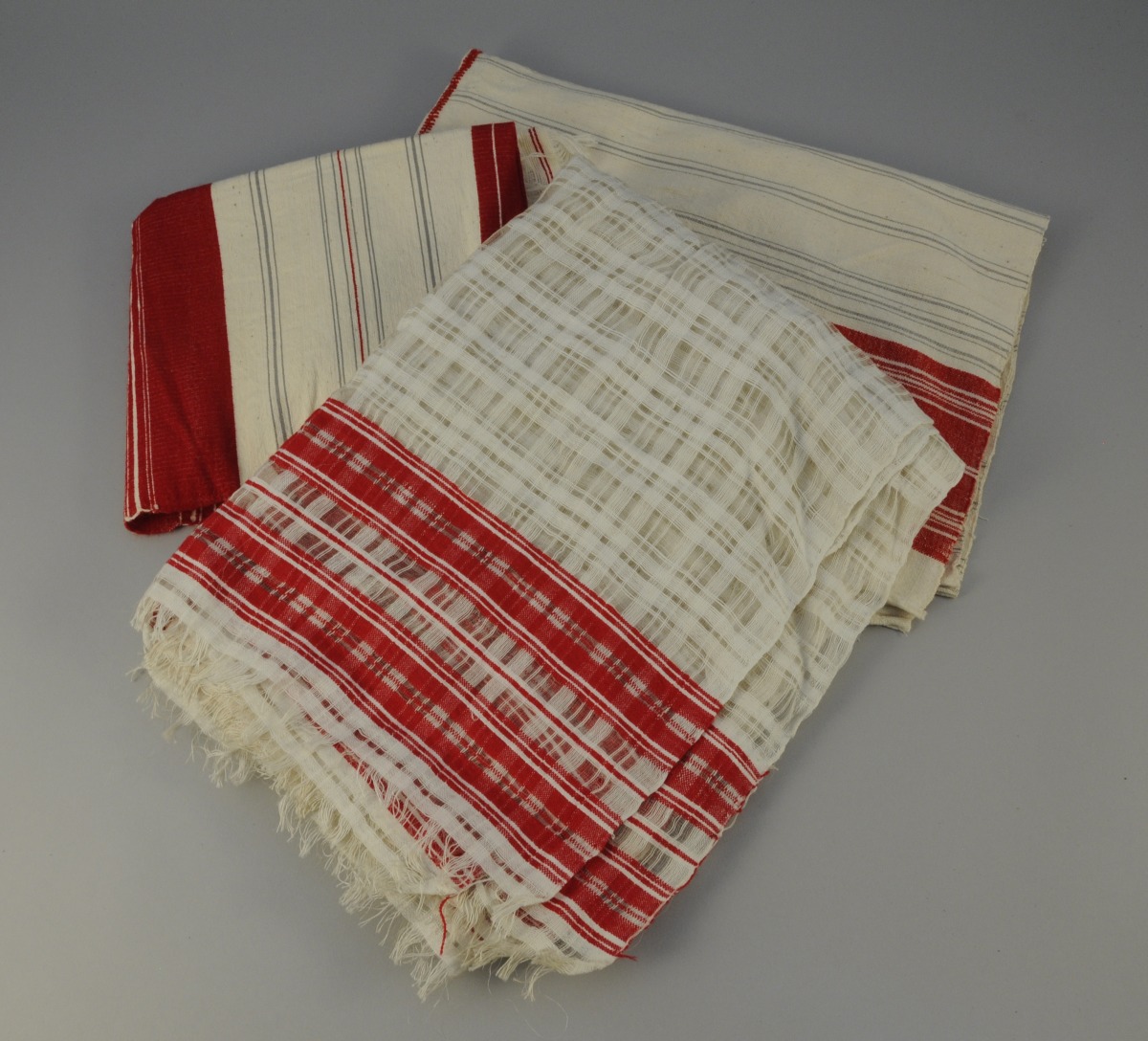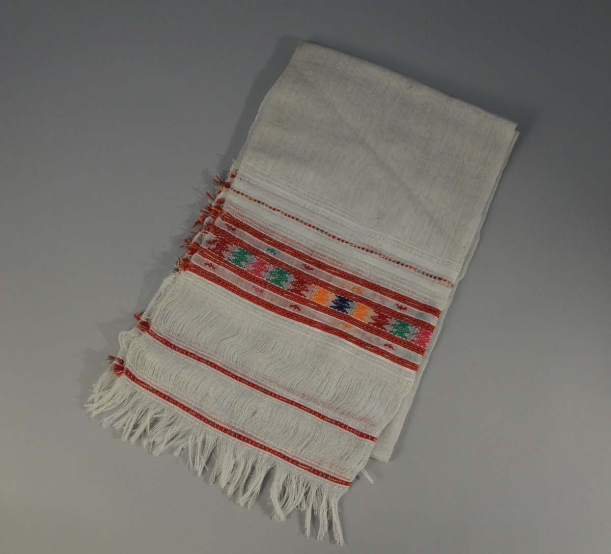 - FOULARD tissé blanc et rouge de Zadrimë, Albanie du Nord. Long. 147, Larg. 110 cm.