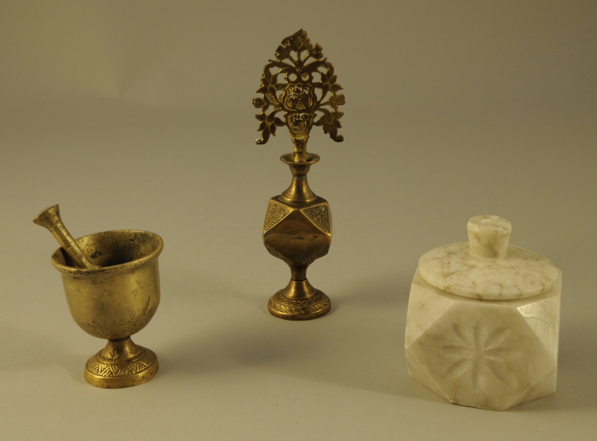 - FLACON à KÔHL en laiton. La panse polygonale à décor floral ciselé. Le bouchon ajouré de fleurs. Haut. 14 cm.