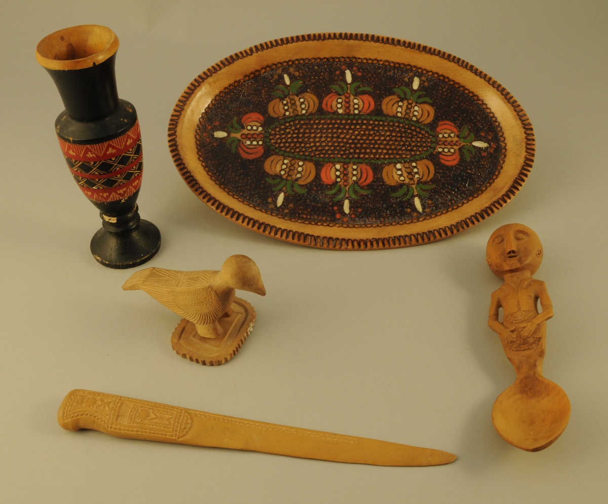 - PLATEAU ovale à décor pyrogravé polychrome de fruits. Long. 31,5, Larg. 21 cm.