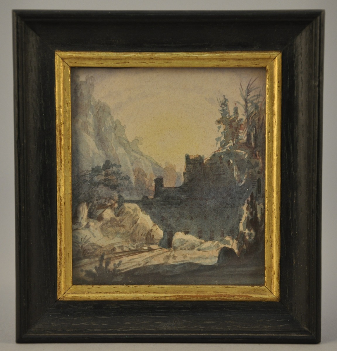 - RUINES dans un paysage montagneux. Aquarelle. 8 x 7 cm.