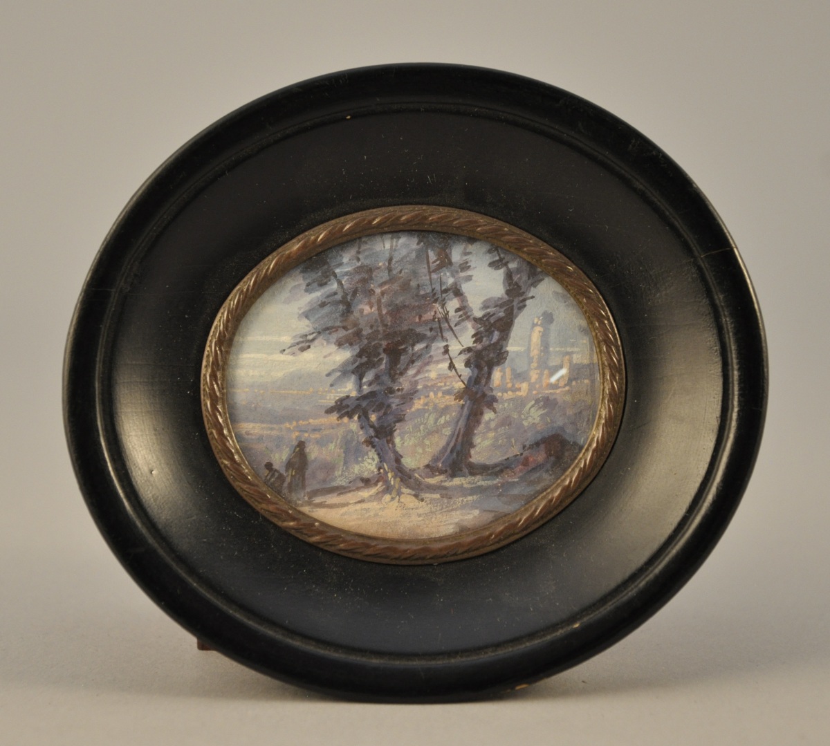 - PAYSAGE animé de personnages. Aquarelle et gouache. Format ovale, 5 x 6 cm.