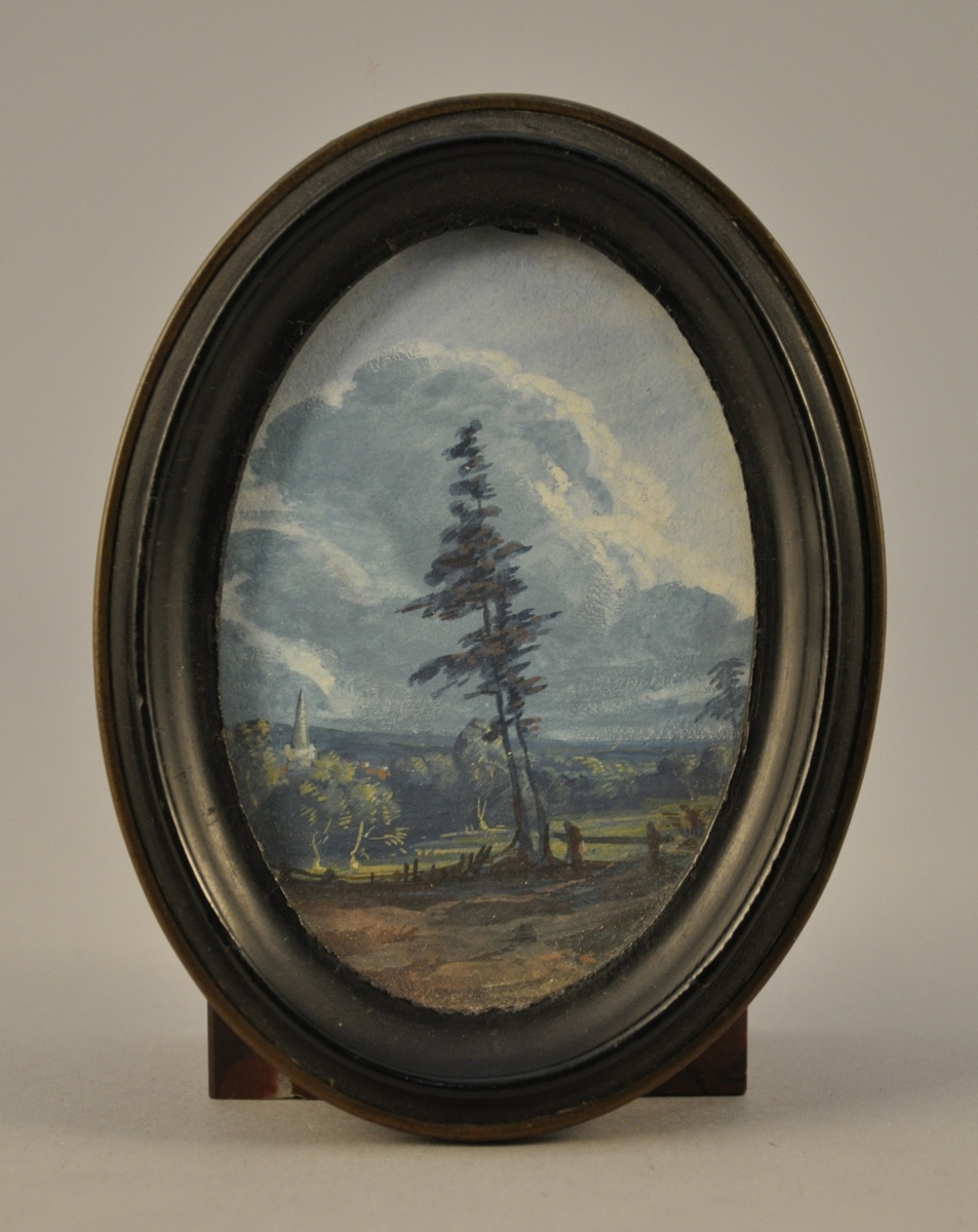 - PAYSAGE au clocher. Aquarelle et gouache. Format ovale, 8,5 x 6 cm.