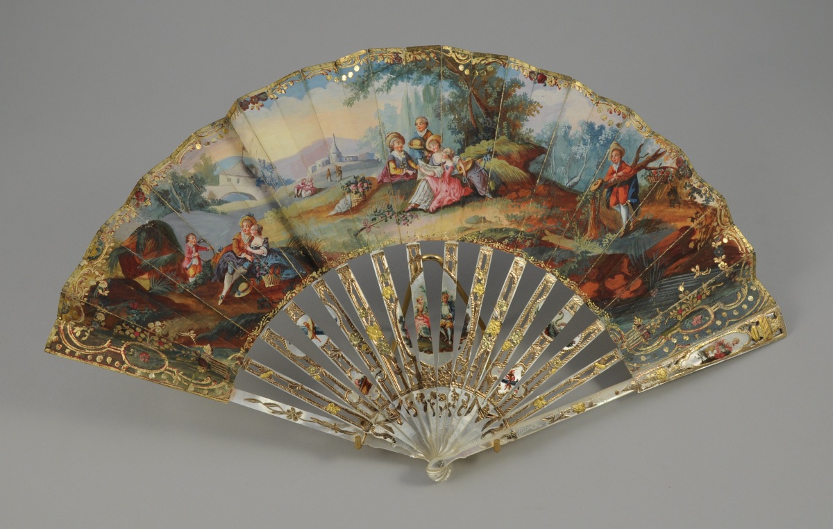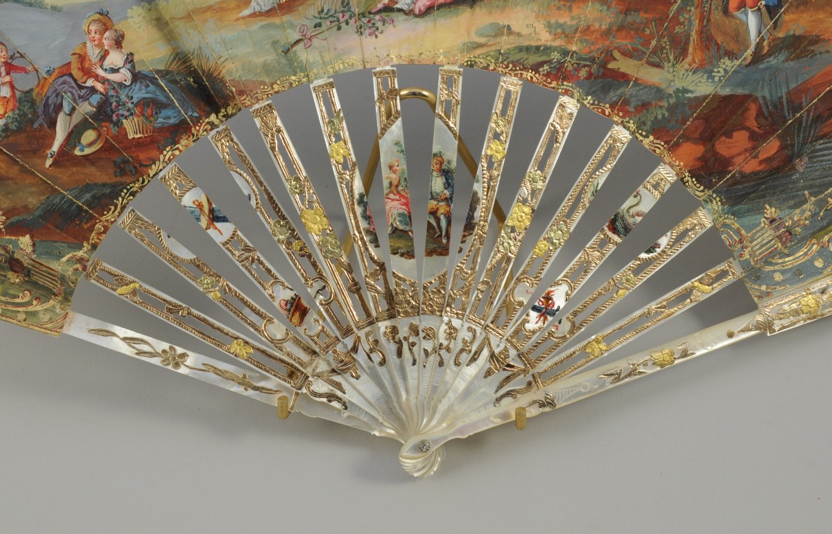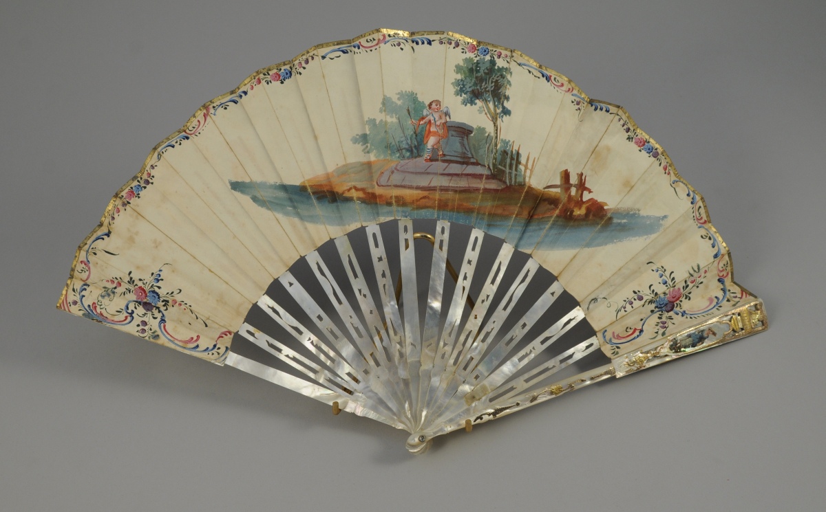 ÉVENTAIL plié. La feuille en papier peint à la gouache d'une scène galante dans un entourage de fleurs et de rinceaux or. Au revers, Cupidon sur un tertre dans un entourage de fleurs et de rinceaux polychromes. Monture en nacre ajourée de fleurs or de différents tons et ornée d'une scène galante et de trophées dans des réserves. Dans une boite en carton gauffré marquée "FÉLIX SIMON". Dans le goût du XVIIIème, seconde moitié du XIXème. Haut. 27,5, Larg. 48 cm. (tâches, légères usures)