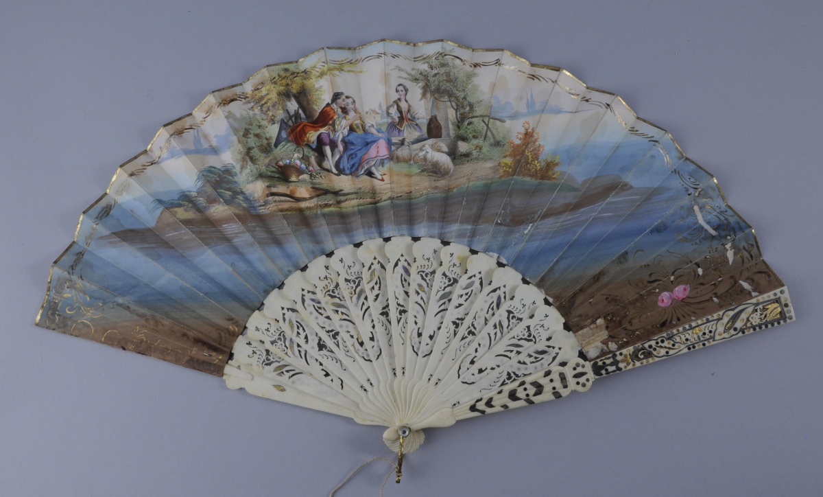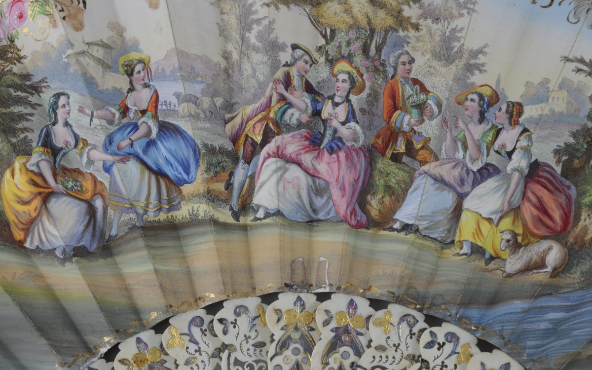 ÉVENTAIL plié. La feuille en papier lithographié et rehaussé à l'aquarelle représentant une scène galante dans un entourage de fleurs et de rinceaux polychromes et or. Au revers, une scène galante à la fontaine dans un entourage de rinceaux or. Monture en os ajourée de fleurs et feuillages or et argent. Bélière en laiton mouvementée. Dans une boite. Dans le goût du XVIIIème, seconde moitié du XIXème. Haut. 27, Larg. 49 cm. (manques, usures)