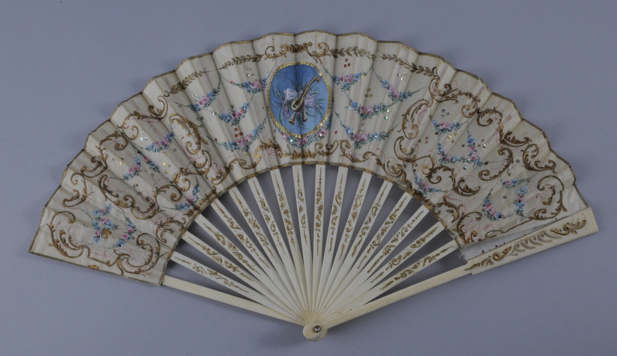 ÉVENTAIL plié. La feuille en soie peinte polychrome et or et brodée de sequins or. Décor dans un médaillon ovale d'un trophée d'instruments de musique dans un entourage de guirlandes de fleurs et de rinceaux. Monture en os ornée de rinceaux or. Le panache orné de deux pierres banches. XIXème. Haut. 22, Larg. 40 cm. (usures)