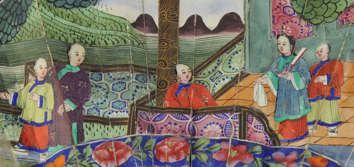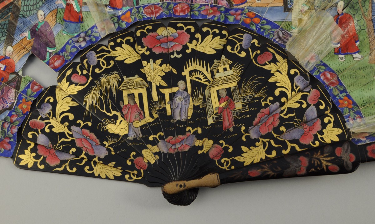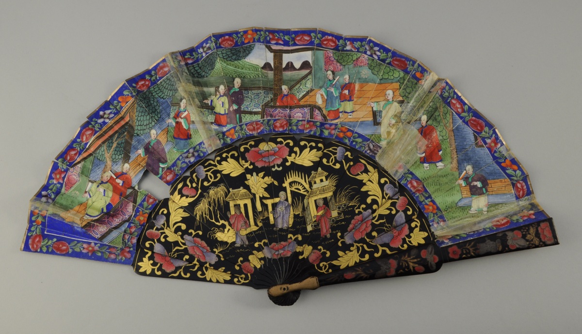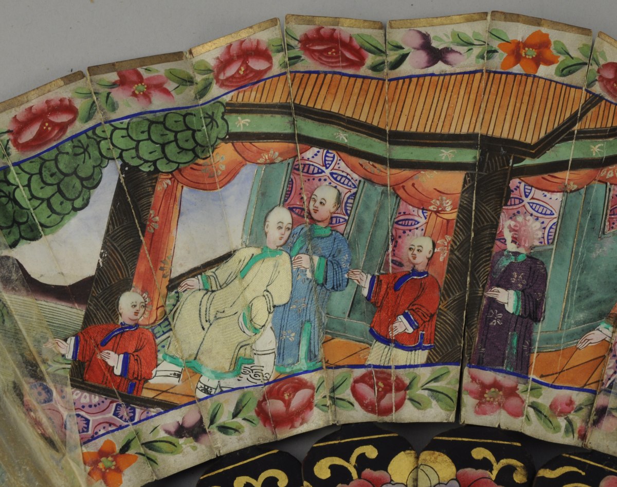 ÉVENTAIL plié. La feuille en papier peinte à la gouache à l'avers et au revers de scènes de palais. Personnages à visage d'ivoire et vêtements de soie. Monture en bambou laqué noir à décor polychrome et or de scènes de jardin. Chine. Seconde moitié du XIXème. Haut. 26 cm. (accidents, usures)