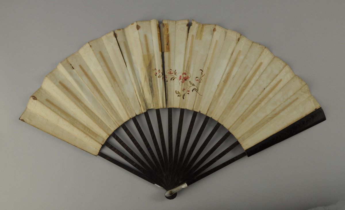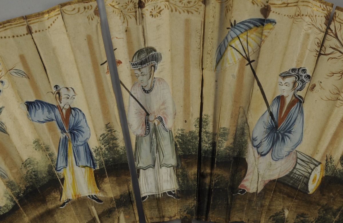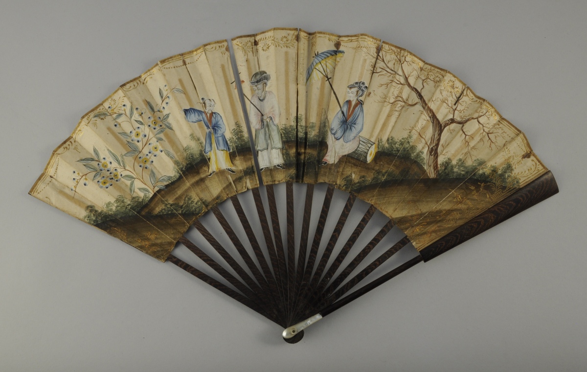 ÉVENTAIL plié. La feuille en papier peint de trois chinois dans un paysage champêtre. Le bord à décor de rinceaux or. Le revers peint d'une pivoine. Monture en bois exotique. La partie basse du panache plaqué de nacre. Travail ancien dans le goût de la Chine. Haut. 30, Larg. 50 cm. (accidents, déchirures, usures)
