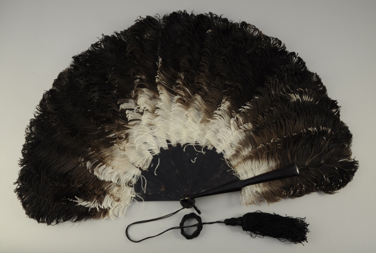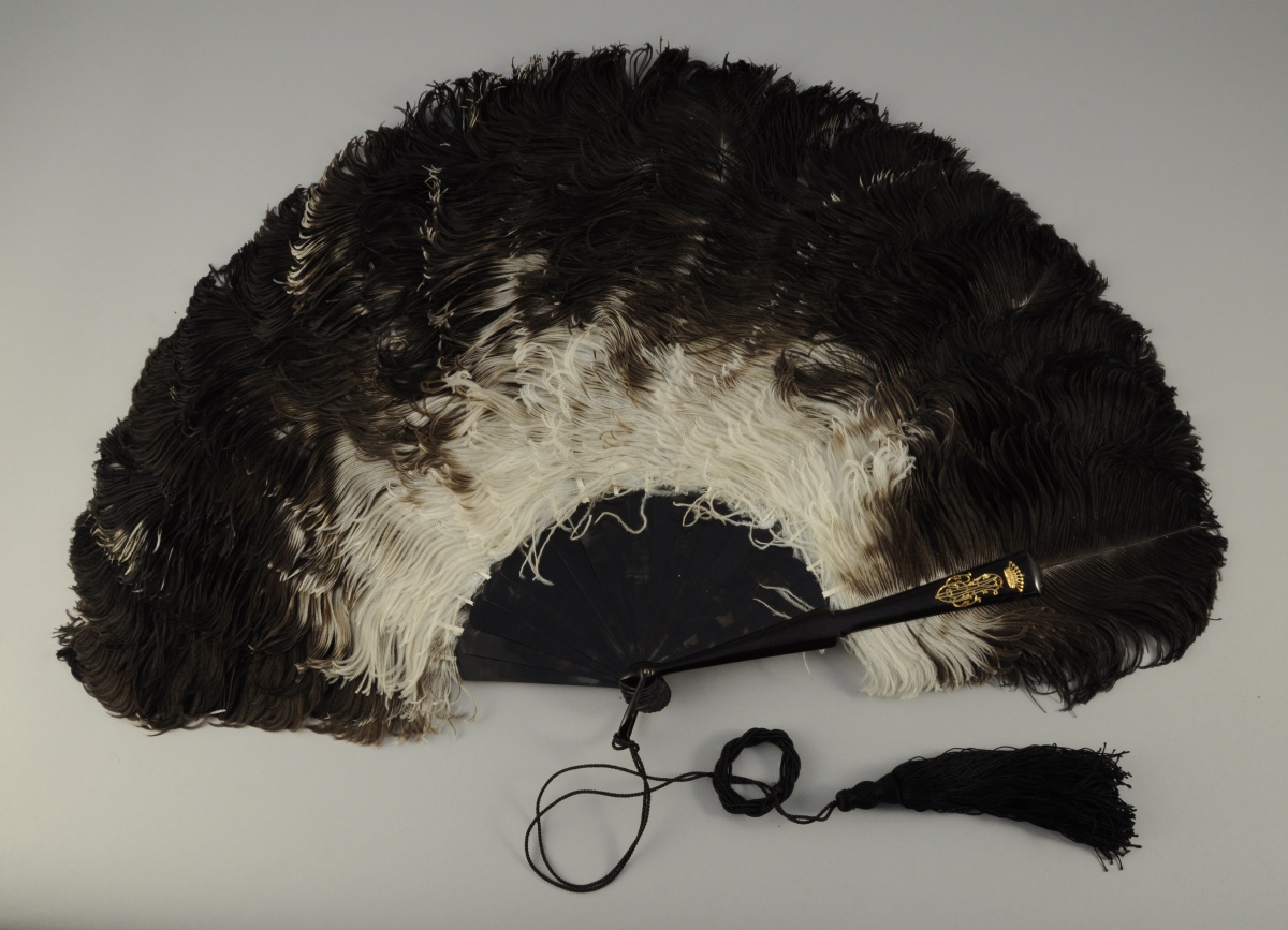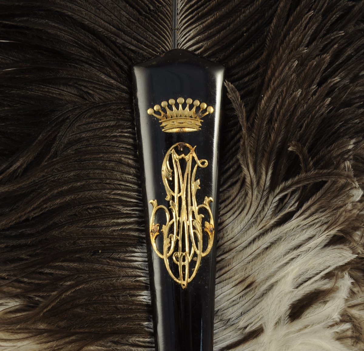 ÉVENTAIL brisé en plumes d'autruche femelle brunes et blanches. La monture en écaille. Le panache monogrammé "MA". Bélière et gland noir. Dans sa boite signée "A. RODIEN / 48, rue Cambon" et portant le monogramme "MJ" couronné. Napoléon III. Haut. 44, Larg. 70 cm. (un fil rompu, frottements sur la monture)