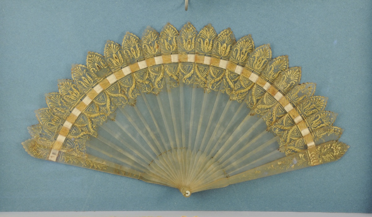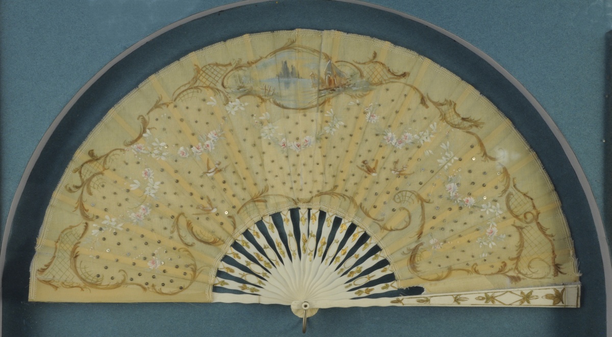 - ÉVENTAIL plié. La feuille en gaze brodée de sequins et peinte à la gouache dans un cartouche mouvementé d'une scène lacustre dans un entourage de guirlandes fleuries et de rinceaux. La monture en os à décor or de médaillons ovales et feuillages. Bélière en laiton. XIXème. Haut. 22, Larg. 40 cm (à vue). (usures, déchirures)