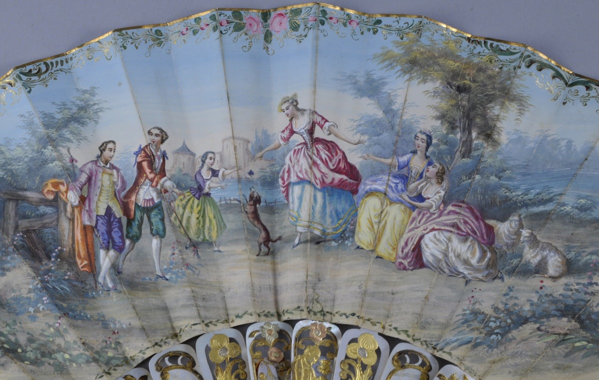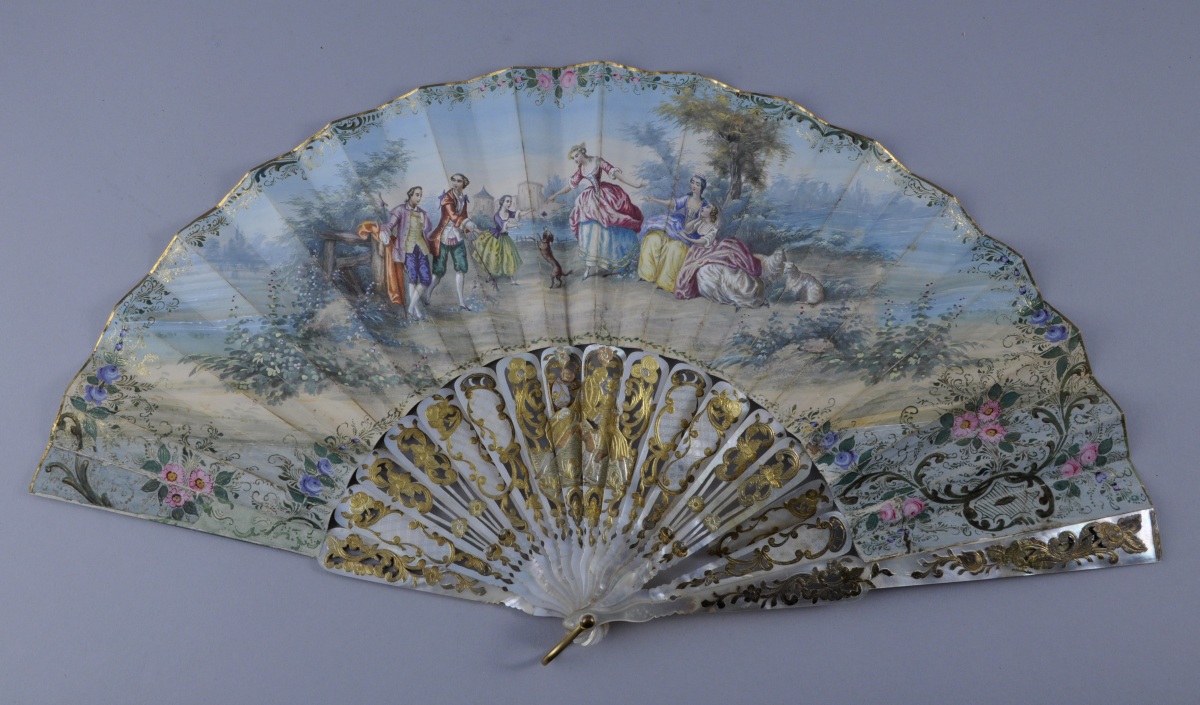 ÉVENTAIL plié. La feuille en papier peint à la gouache d'une scène pastorale dans un entourage de fleurs et de rinceaux. Au revers, une petite scène lacustre dans un entourage de fleurs et de rinceaux. Monture en nacre ajourée de rinceaux fleuris or. Bélière en laiton. Dans une boite tapissée marquée "E. BUISSOT". Seconde moitié du XVIIIème. Haut. 26,5, Larg. 48,5 cm. (accidents, restaurations, usures)