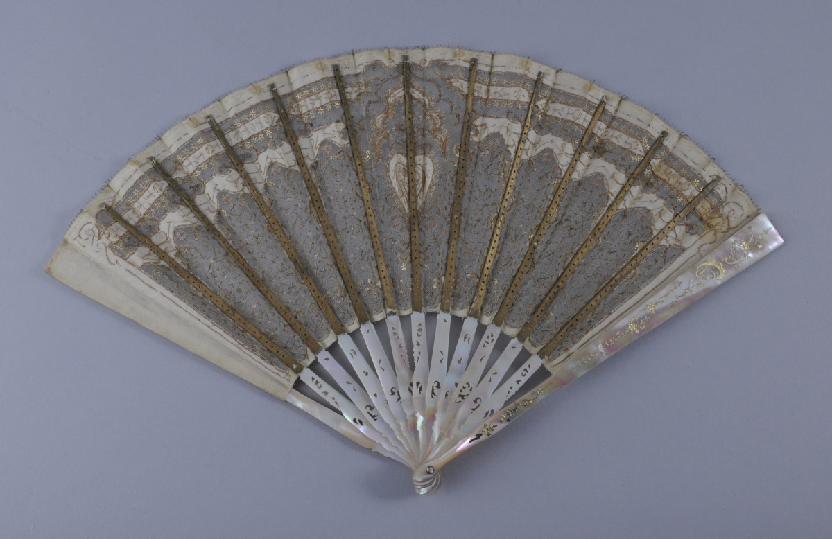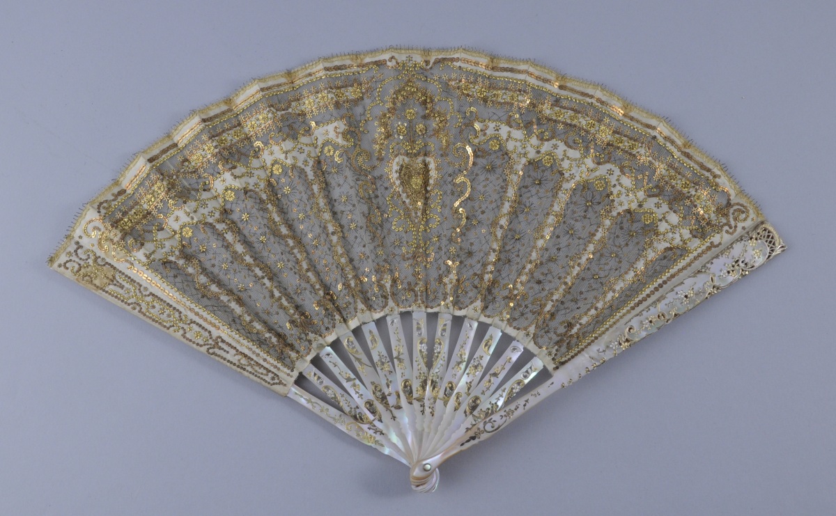 ÉVENTAIL plié. La feuille en tulle brodé de sequins or ornée d'un motif central en forme de coeur. Monture en nacre ajourée de rinceaux fleuris or et argent. Dans une boite tapissée marquée "FAUCON / 88, avenue de l'Opéra / PARIS". Fin XIXème. Haut. 25, Larg. 40 cm. (tâches, petits manques)