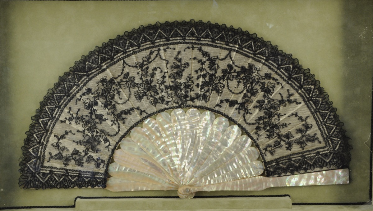 ÉVENTAIL plié. La feuille en dentelle noire à décor floral. Monture en nacre. Dans un cadre. Fin XIXème. Haut. 25, Larg. 48 cm (à vue).