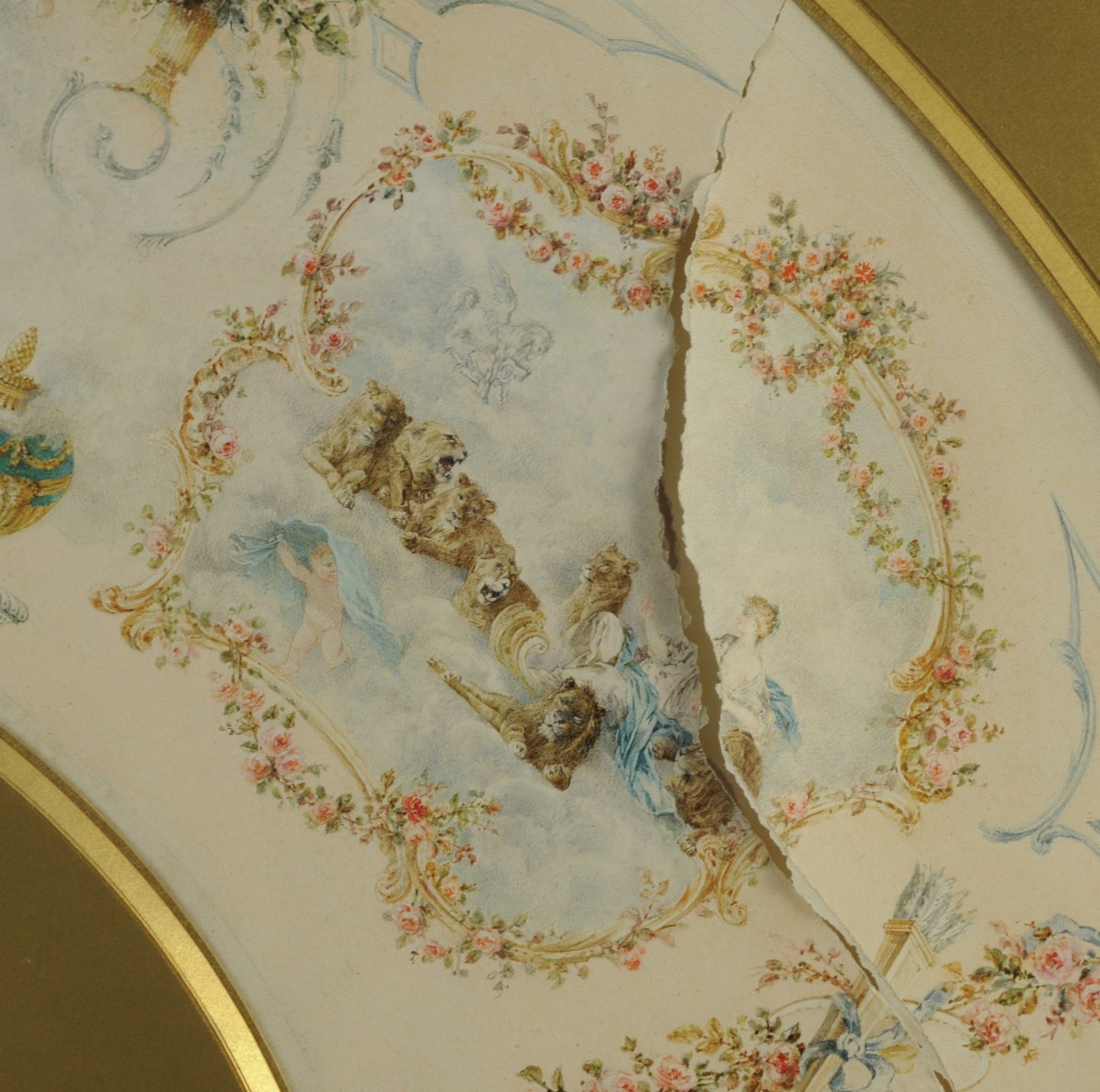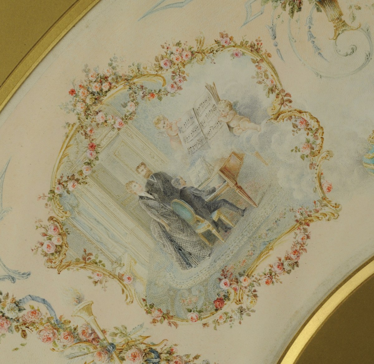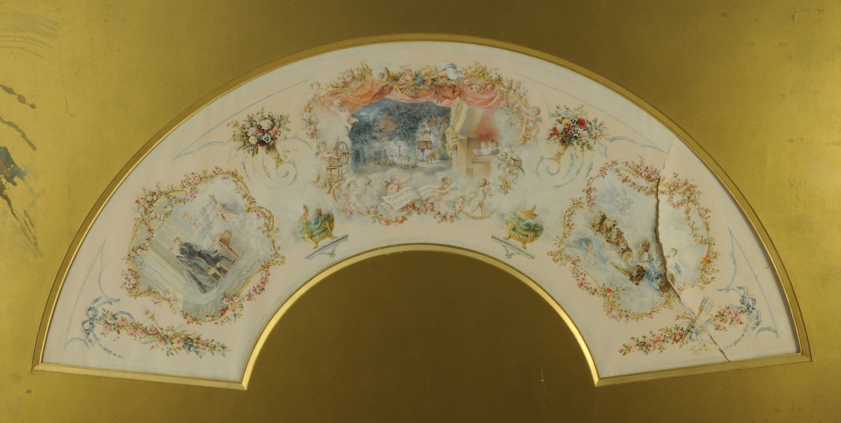 PROJET d'ÉVENTAIL, sur feuille ornée de 3 scènes dans des réserves d'Allégories sur le thème de l'Amour et de la Musique. Entourage de fleurs, guirlandes, carquois, et pot à feu.