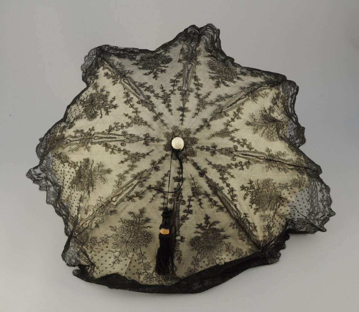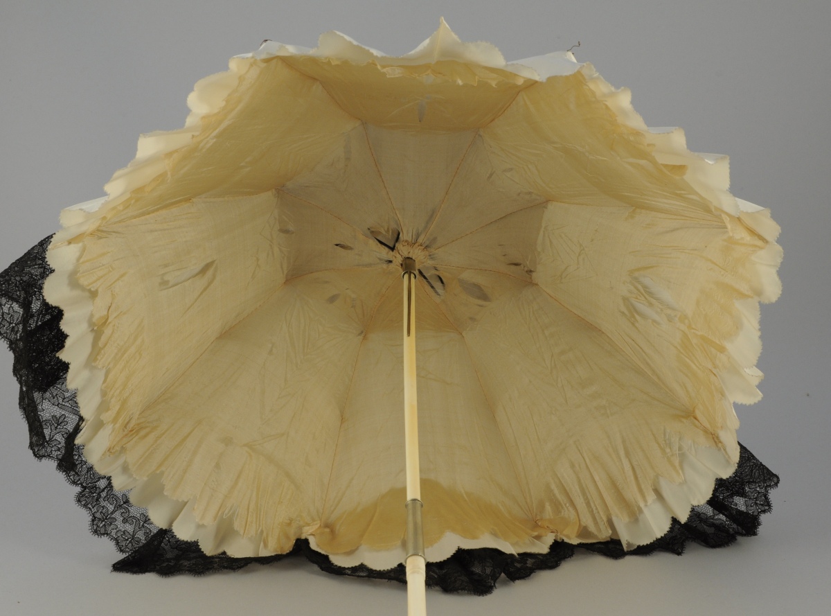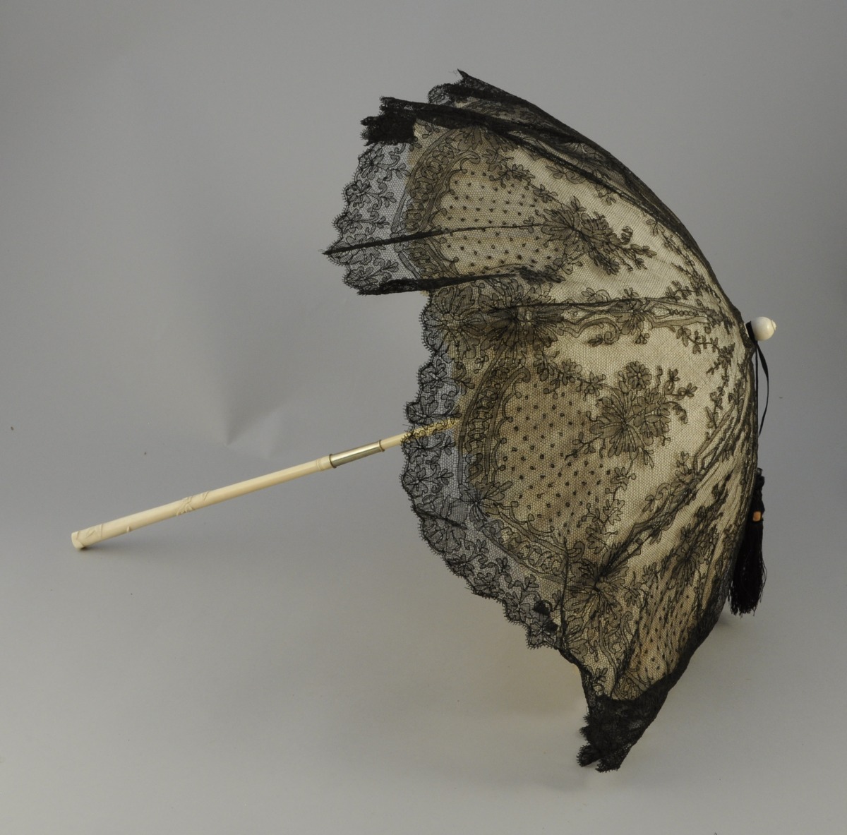 OMBRELLE marquise. La couverture en dentelle noire doublée de soie crème et sommée d'un gland. Le manche et le mât en ivoire à décor en léger relief de branchages fleuris. La virole en métal argenté. Napoléon III. Long. 61 cm. (déchirures à la doublure)