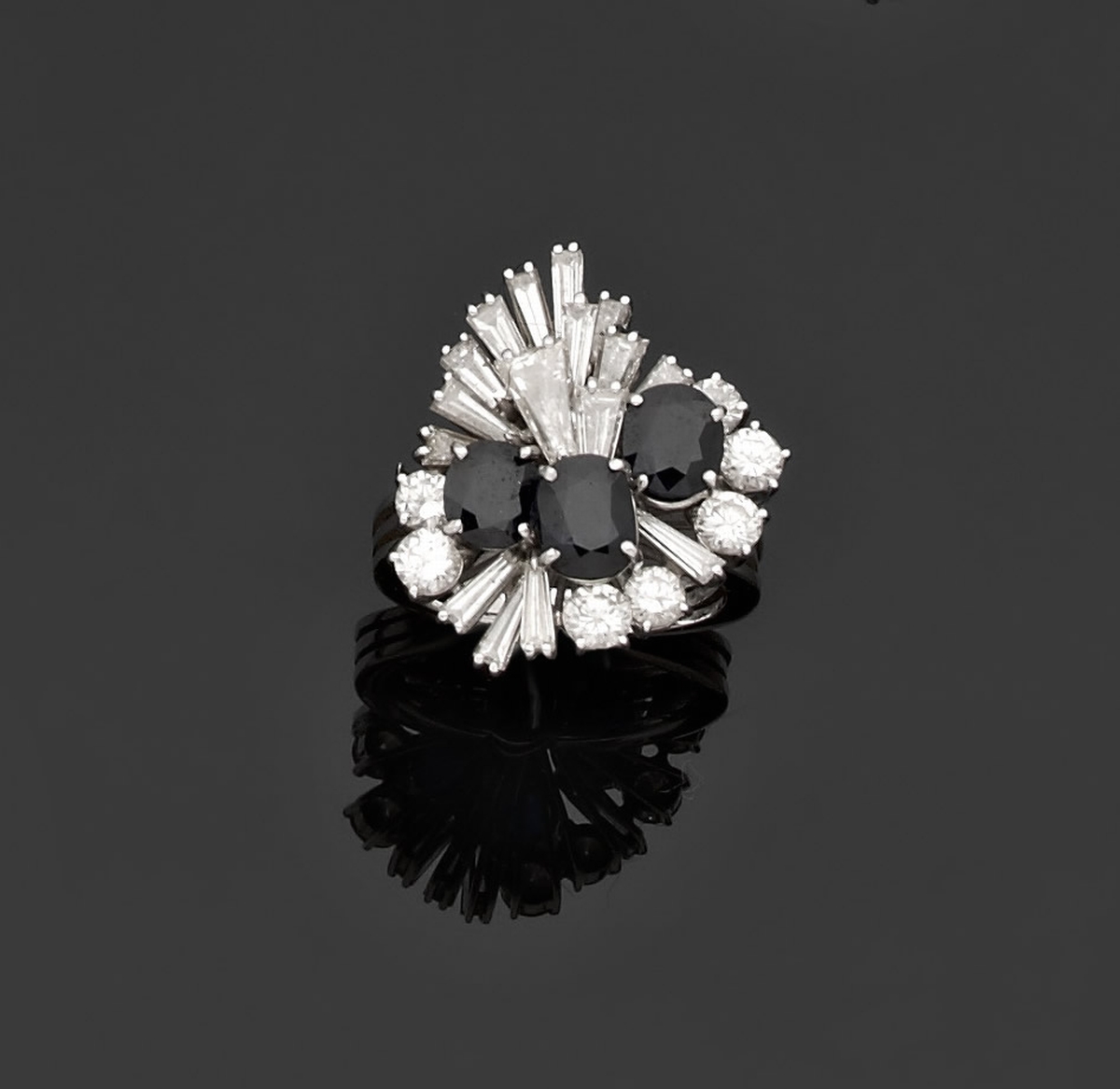 BAGUE "faisceau" en or gris, sertie de trois saphirs de forme ovale dans un pavage de diamants ronds et trapèzes.