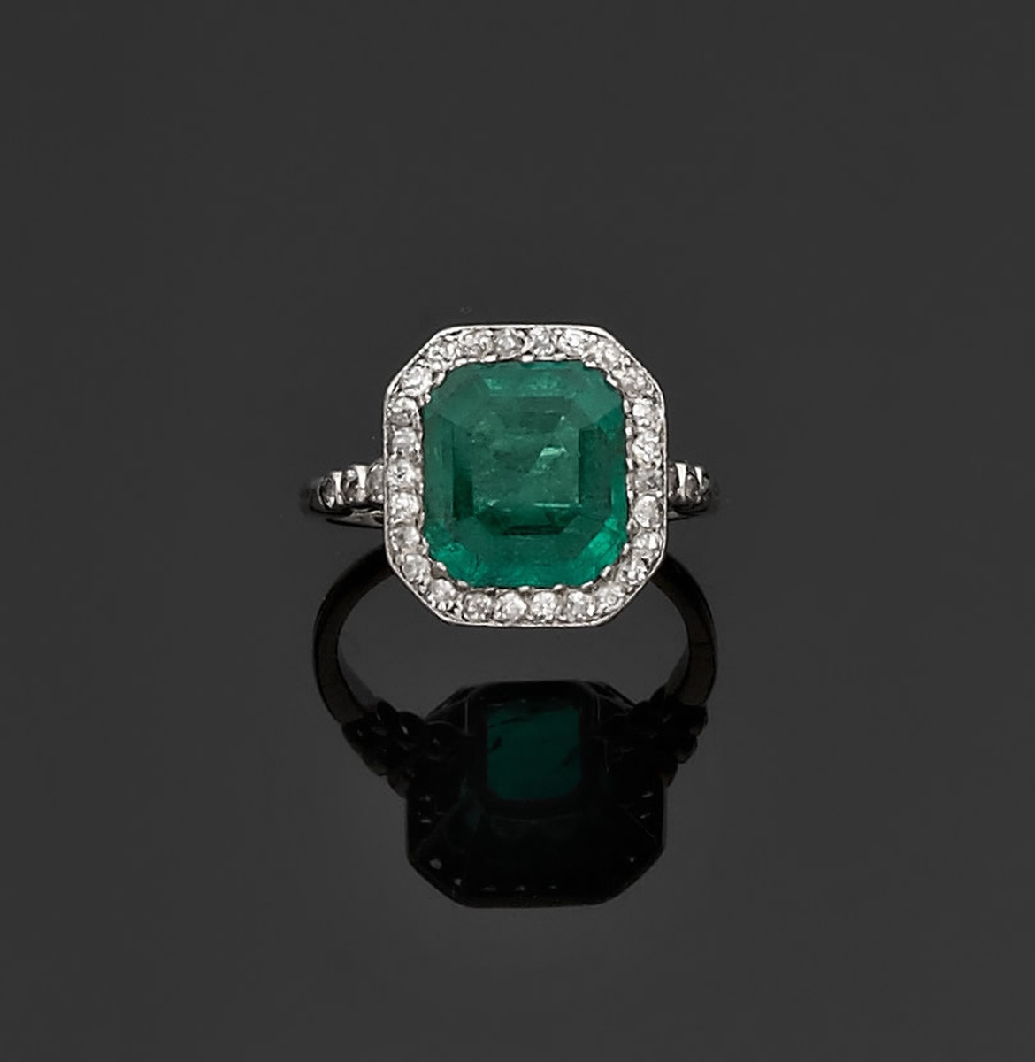 BAGUE ornée d'une émeraude rectangulaire à pans coupés dans un entourage de petits diamants de taille ancienne, la monture en platine et or gris sertie de six petits diamants.