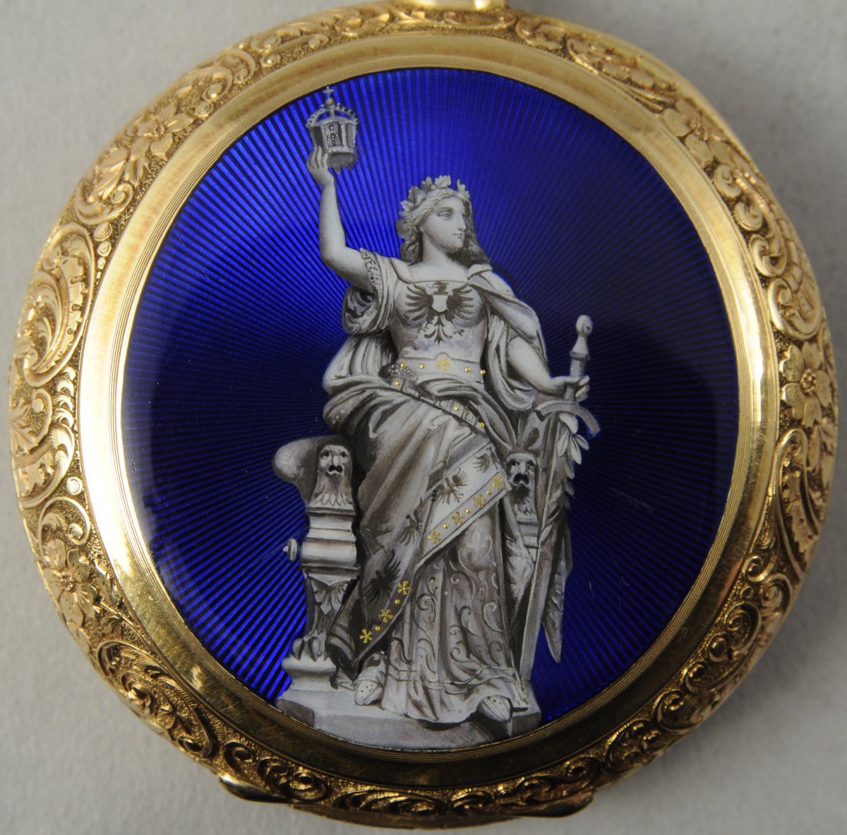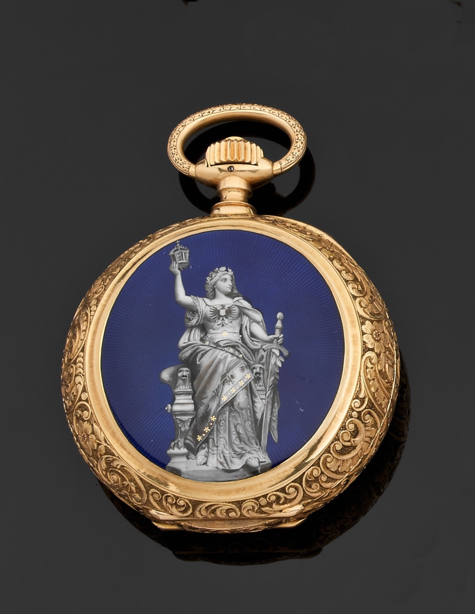 MONTRE de poche à remontoir au pendant, de forme savonnette en or jaune, unie sur une face et émaillée sur l'autre face d'une femme à l'antique tenant un glaive et une couronne, correspondant à l'allégorie de la famille Hohenzollern, roi de Prusse et Empereur d'Allemagne. Sa poitrine est ornée de l'aigle noir et la carrure entièrement décorée de fleurs et agrafes de feuillage.