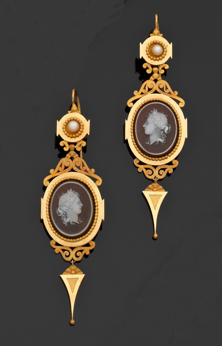 PAIRE DE PENDANTS D'OREILLES en or jaune, chacun orné d'un camée cornaline représentant un profil de femme.